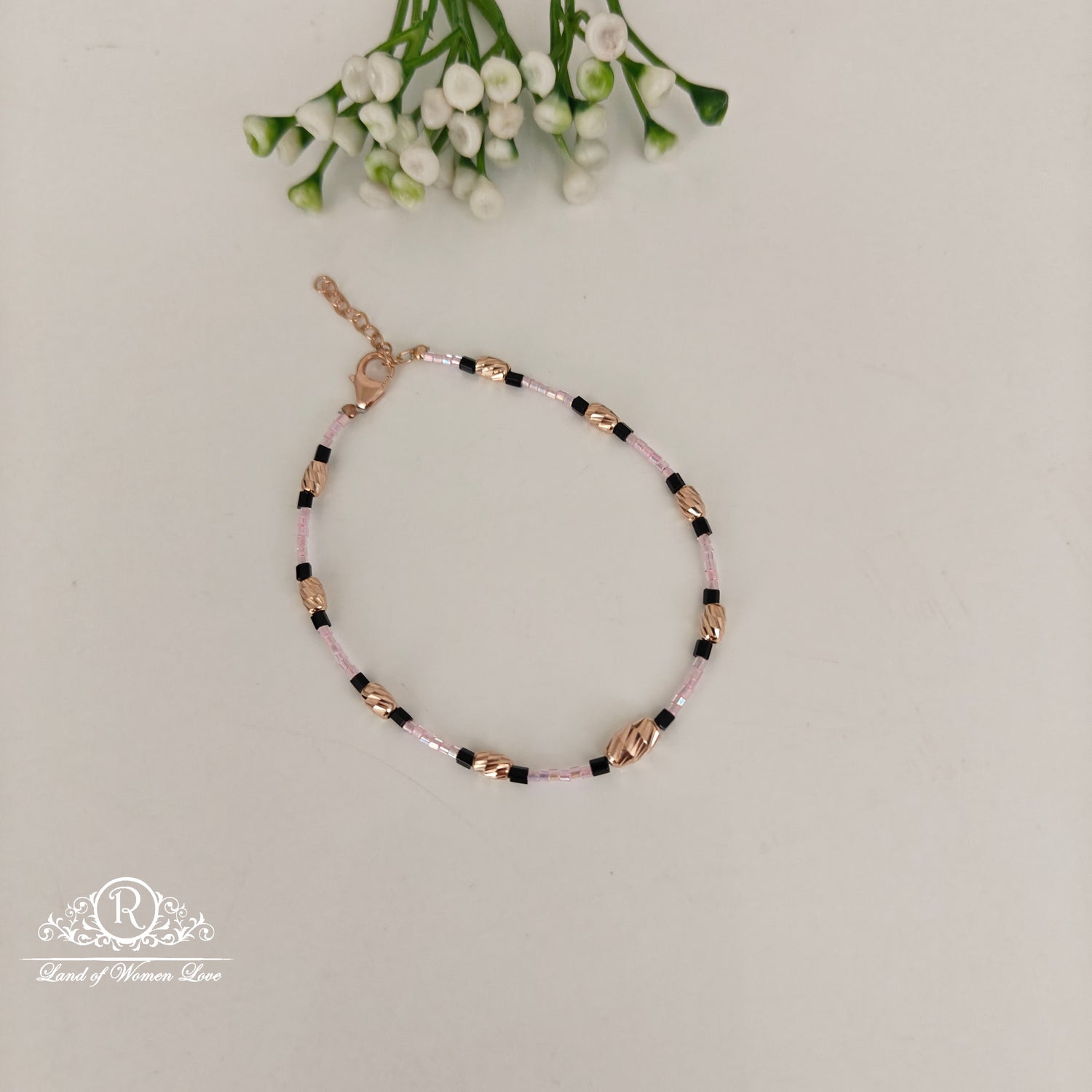 92.5 SILVER ROSE GOLD POLISH BLACK BEADS BRACELET-RCRB62