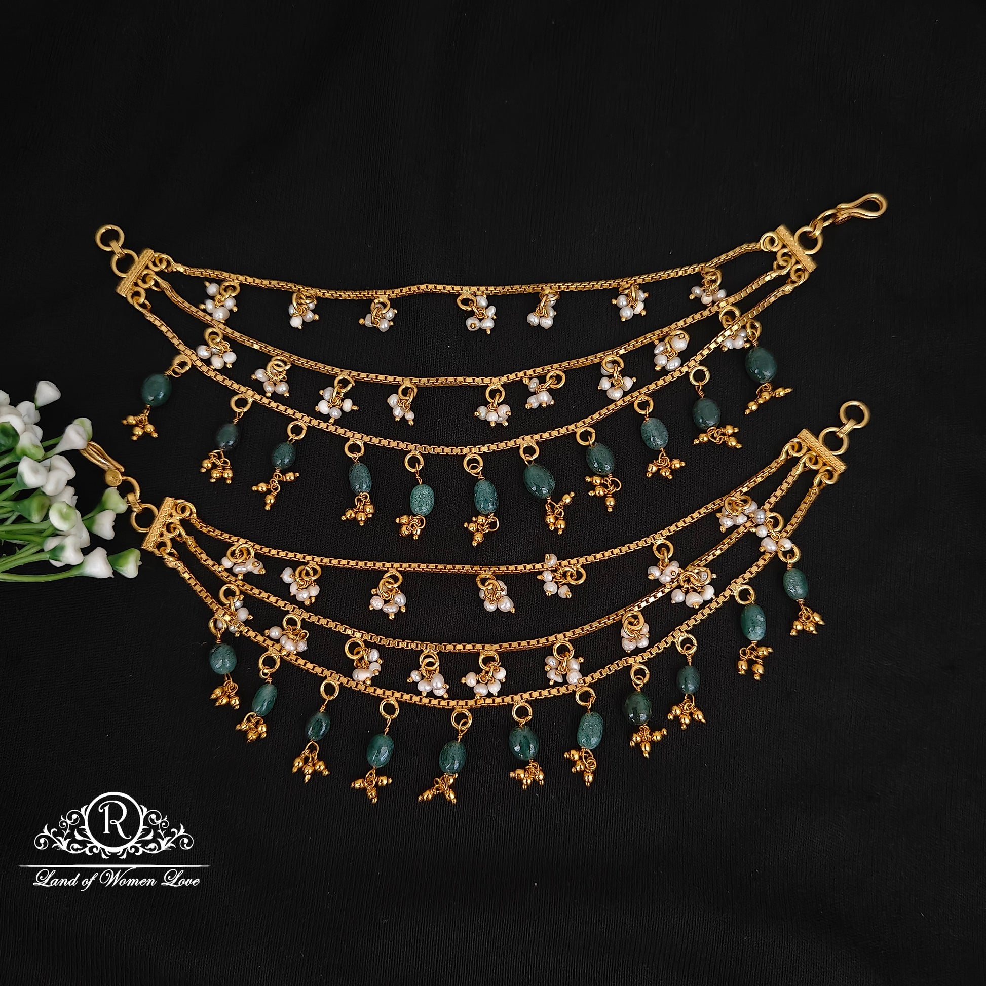 92.5 silver with gold polish 3 lines pearls with green beads earchains 7 inches by RamalaCollections
