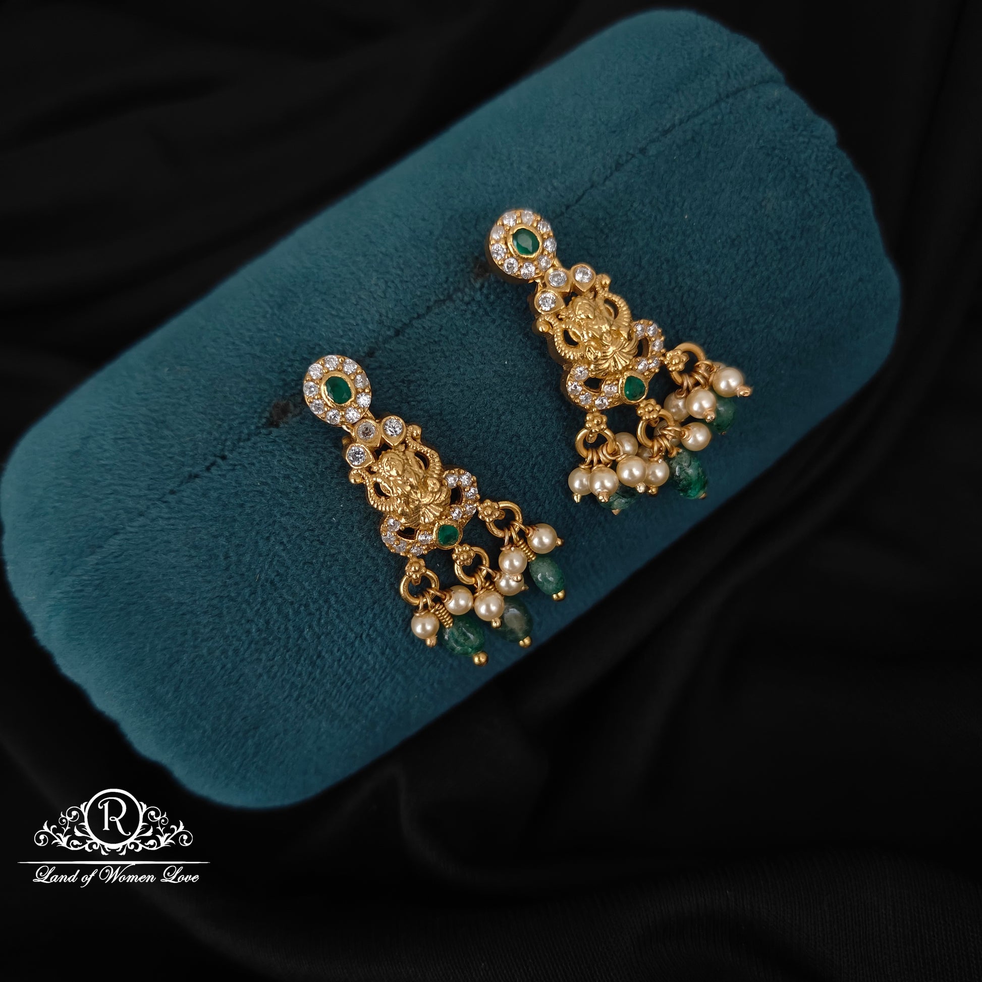 92.5 silver gold polish lakshmi devi earrings pearls and green beads drops desgin 1.5 inches length desgin by ramala collectins