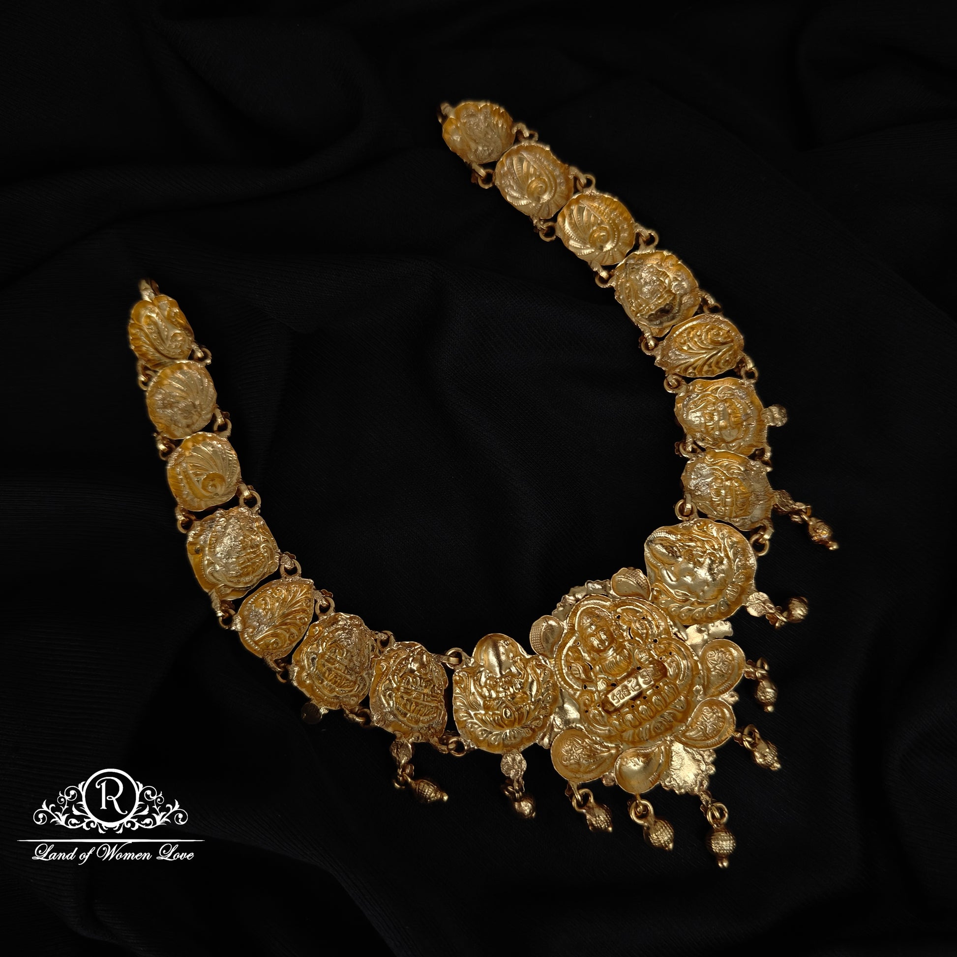 92.5 silver with gold polish lakshmi devi with peacock desgin with gold balls drops beautiful necklace 12 inches length desgin by RamalaCollections