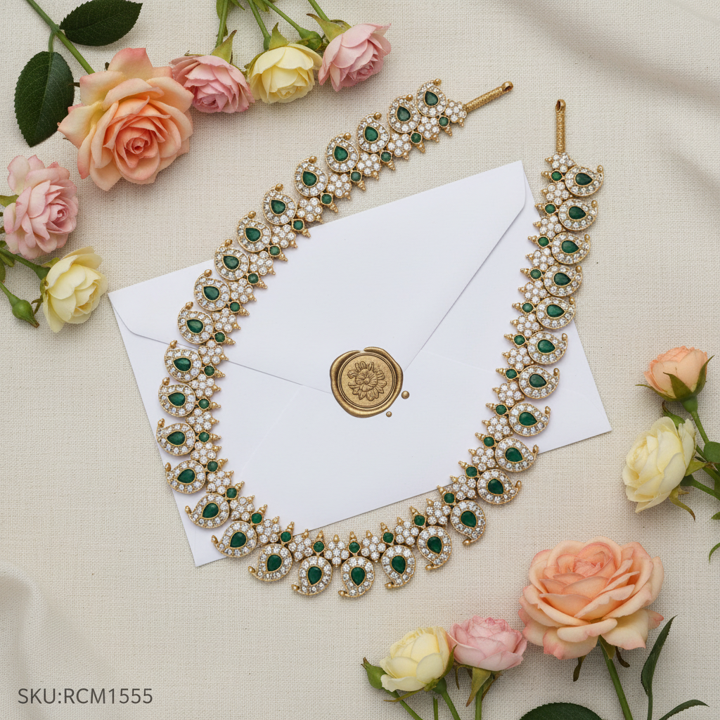 92.5 silver with gold polish stone white with green stone mango desgin besautiful haram 12 inches length desgin by Ramala Collections
