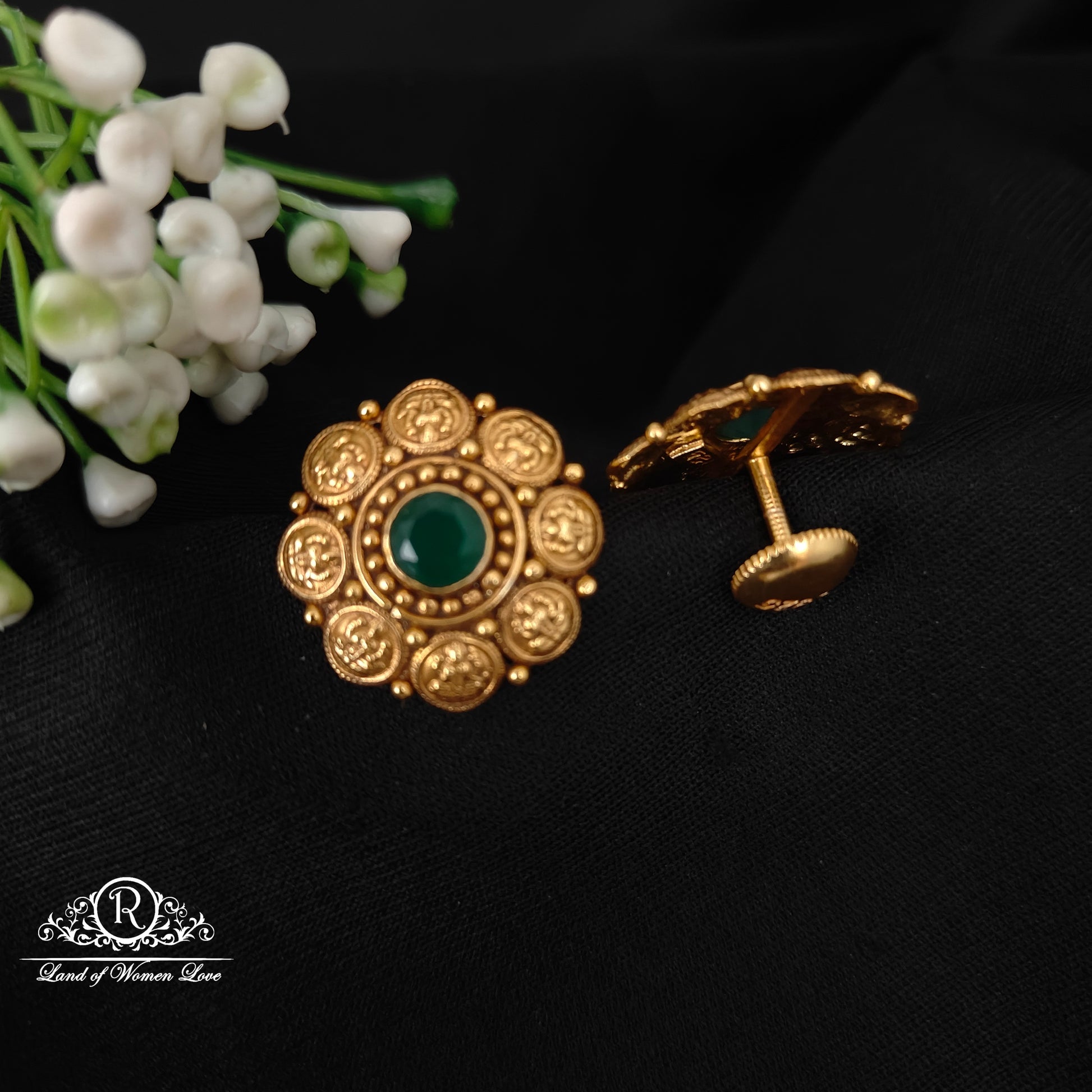 92.5 silver with gold polish light weight gold replica desgin kasu model green stone stud model earrings 0.5 inche length desgin by ramala collection