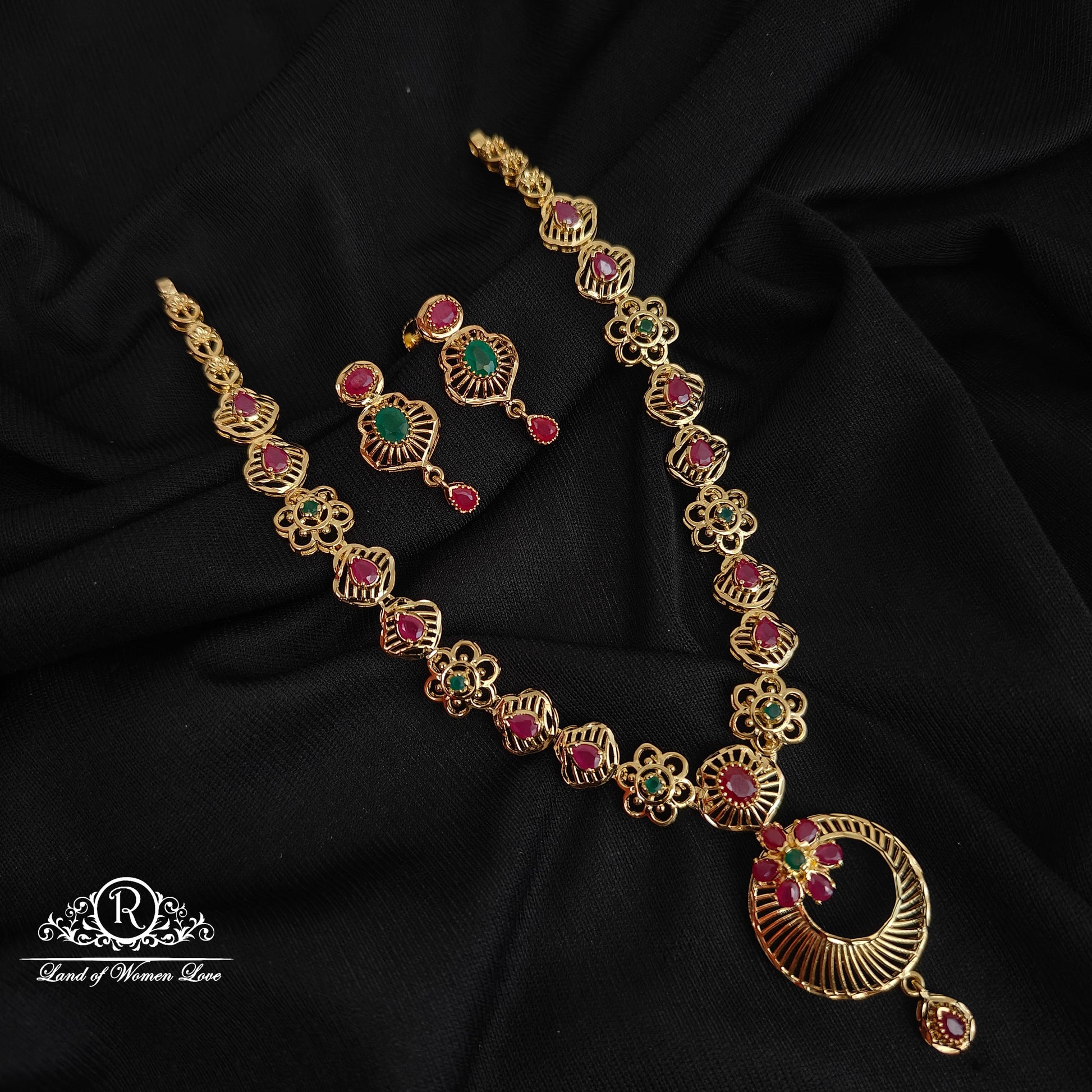 92.5 silver with gold polish ruby necklace chandbali locket desgin with earrings south screw pattern 12 inches length premium quality