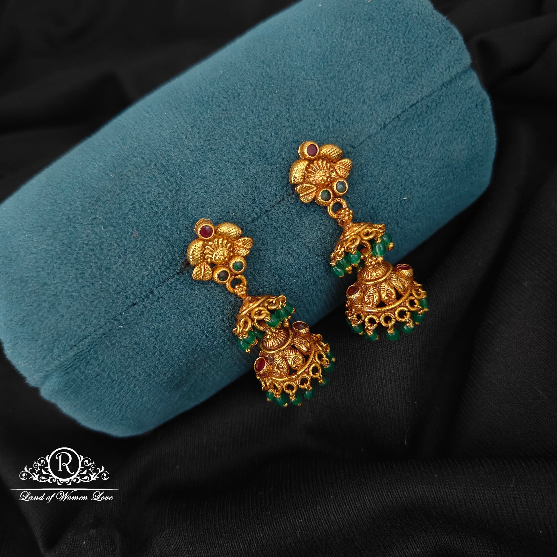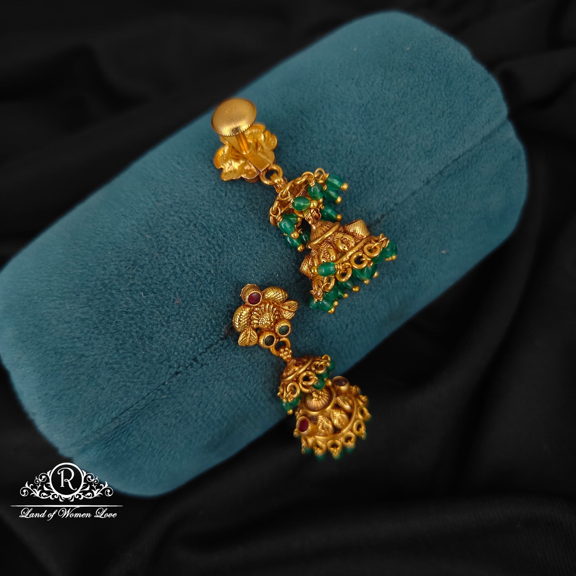 92.5 silver gold and nakshi polish jumkas two steps jumkas green beads drops beautiful desgin 1.8 inches length south screw pattern desgin by ramala collectins