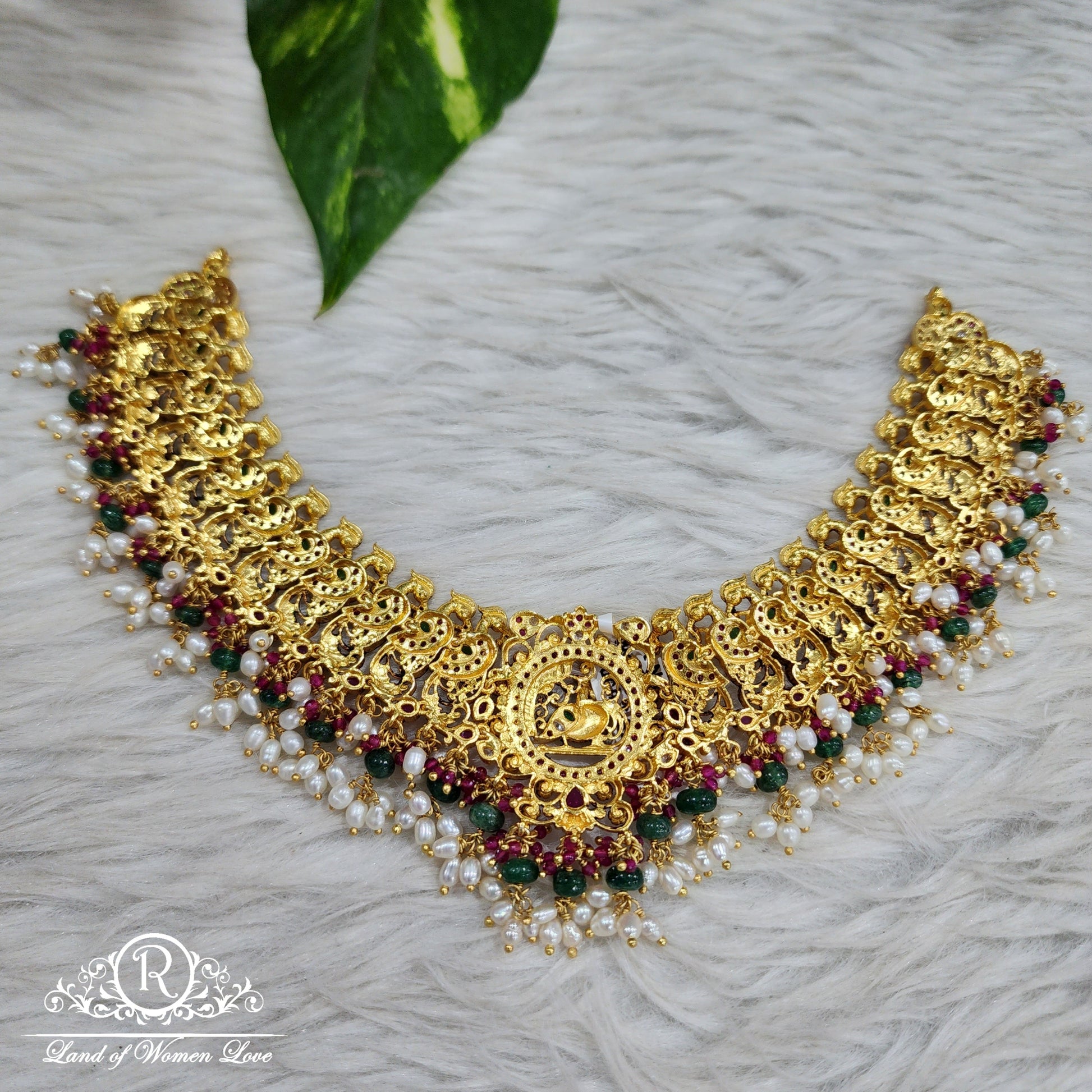 Kempu & Emrald Stone Combination With Hanging Rice palls Necklace-H048