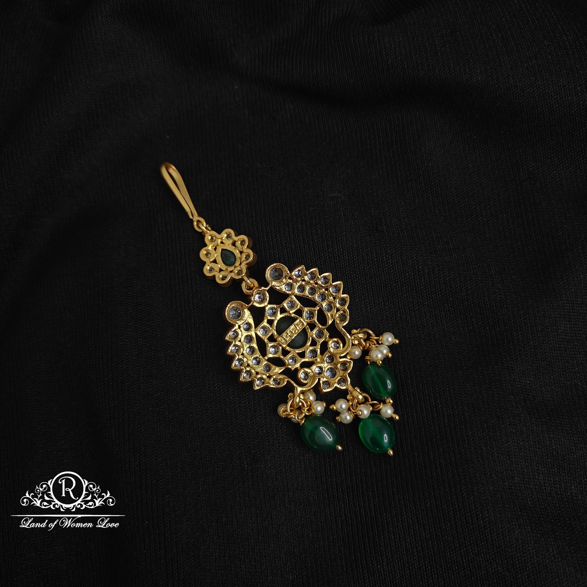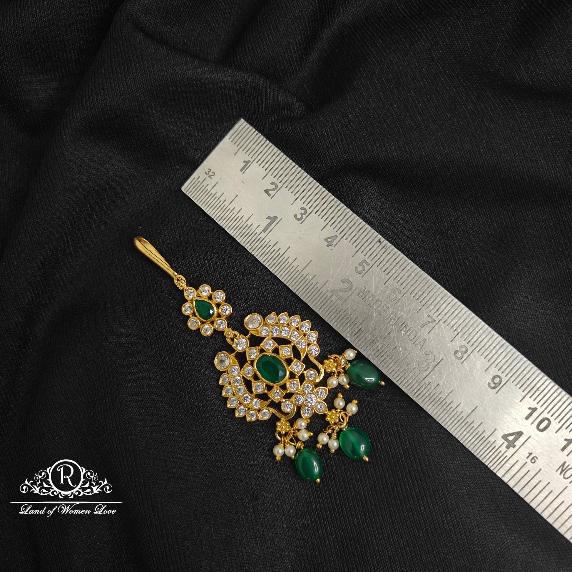 92.5 Silver base 22k gold polish green and white CZ's beautiful Tikka hanging green coloured beads and pearls with 3.2 inches length from Ramala collections ✨