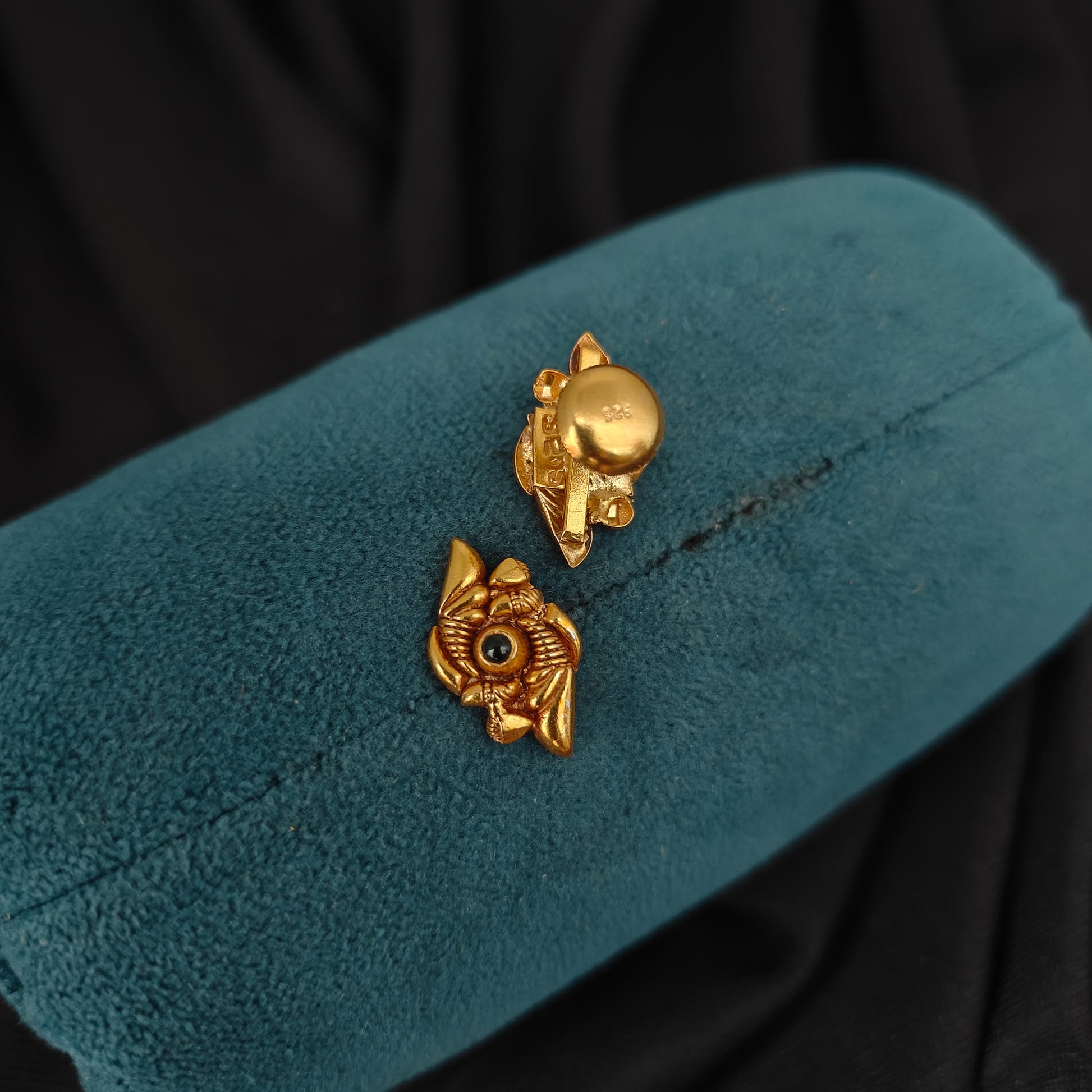 Elevate your ethnic charm with these intricately handcrafted floral stud earrings, featuring a traditional design inspired by vintage temple motifs. Made with a radiant 22K gold finish and highlighted with a delicate ruby-like stone at the center, these studs bring timeless elegance to any ensemble. Perfect for festive occasions, weddings, or traditional celebrations.