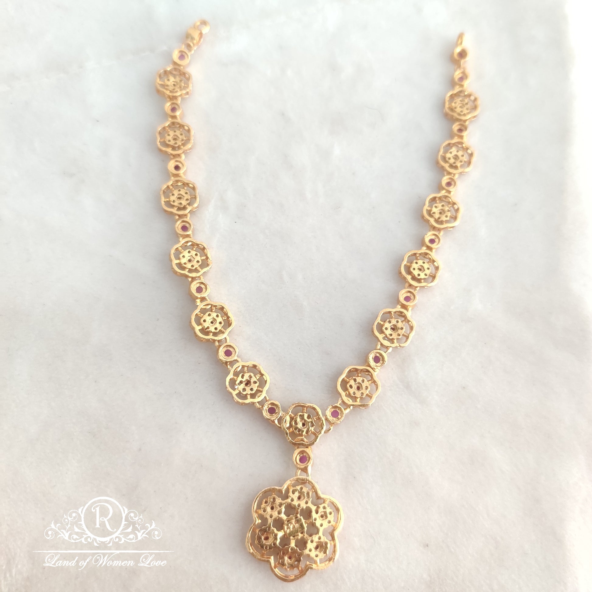 Beautiful 92.5 silver gold polished flower design Necklace with earrings with pink and white stones with 11". Ramala collections