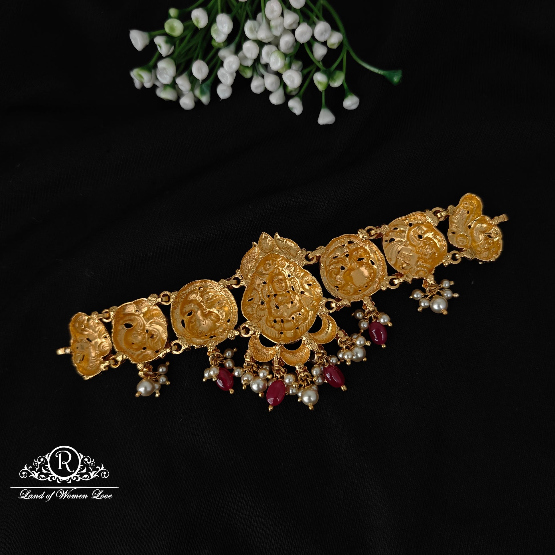 92.5 Silver base 22k gold polish Lakshmi Devi and peacocks design CZ's chocker hanging ruby coloured beads and pearls with 6 inches length from Ramala collections ✨