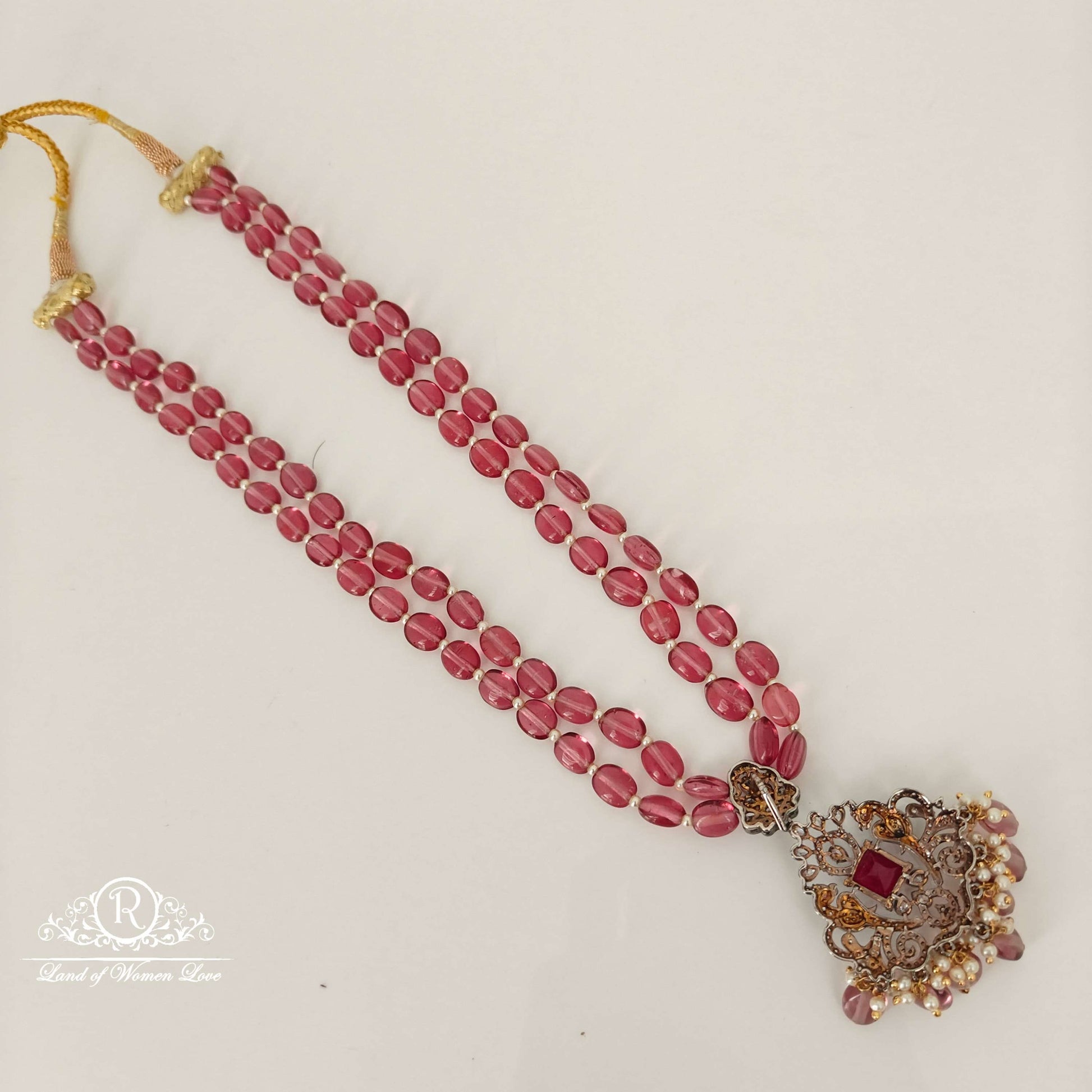 92.5 Silver base 22k gold polish Pink Beads Mala with locket hanging pearls and beads with 20 inches length from Ramala collections ✨