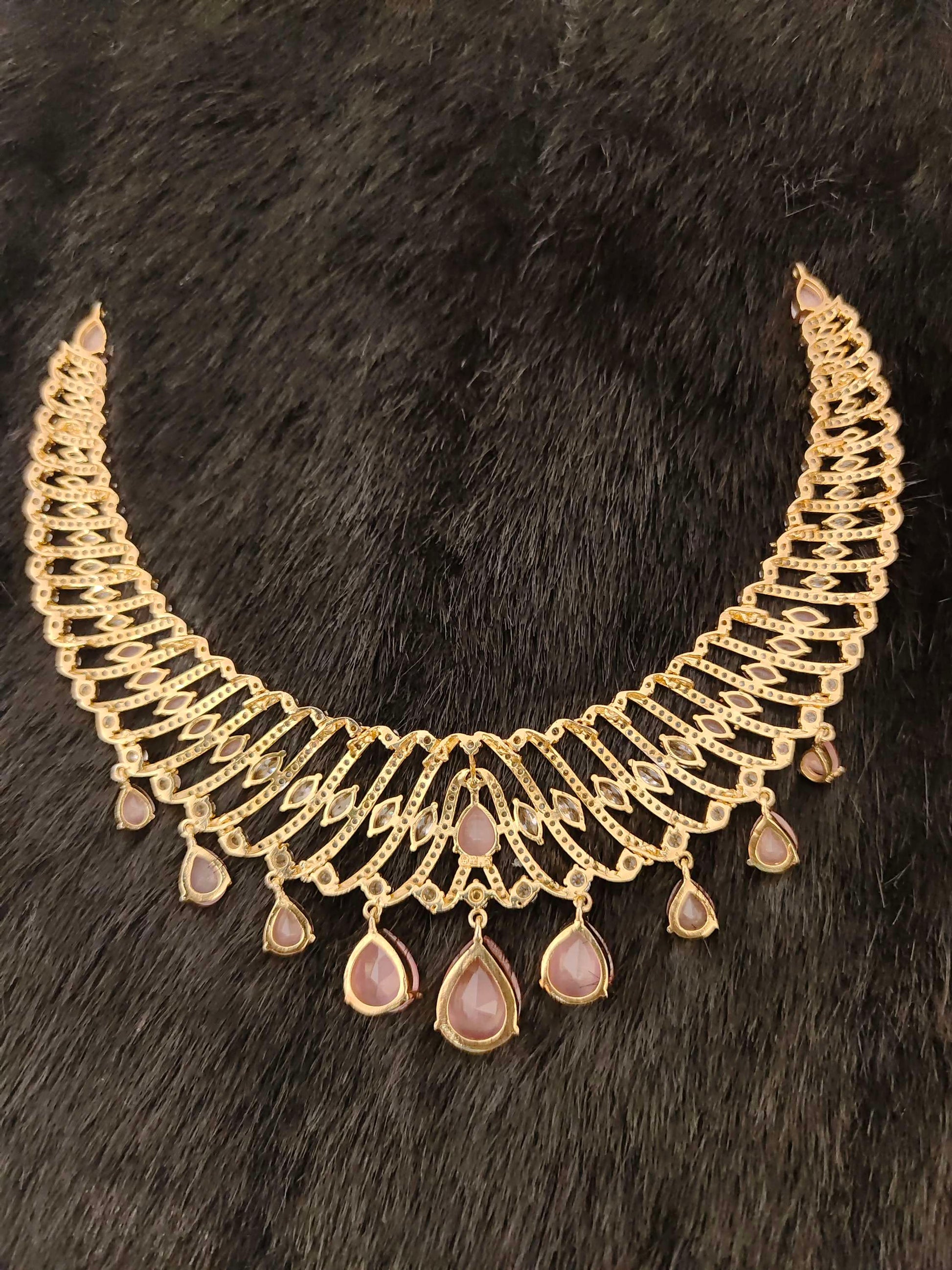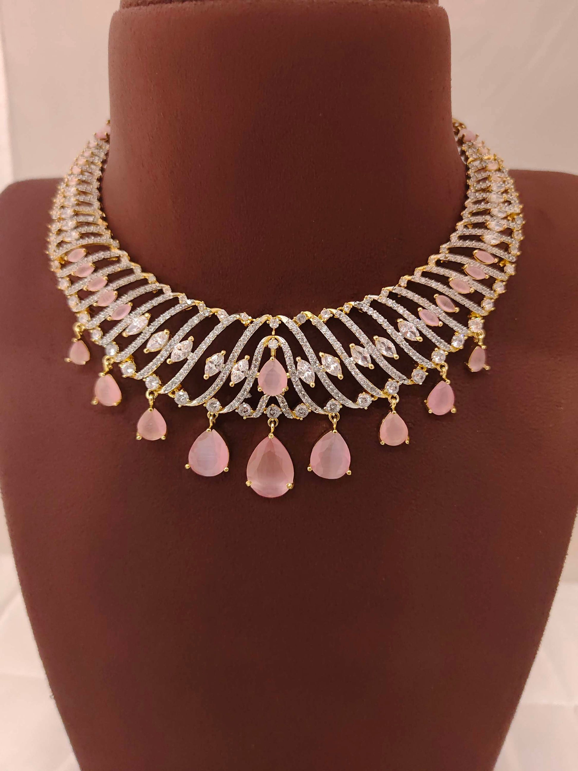 92.5 Silver Jewelry Beautiful Cz Stones With Dimond Design Necklace With 22k Gold Coating With White Stones Middle Light Pink Stones Hanging Stones With 9" Inches .From Ramalacollections
