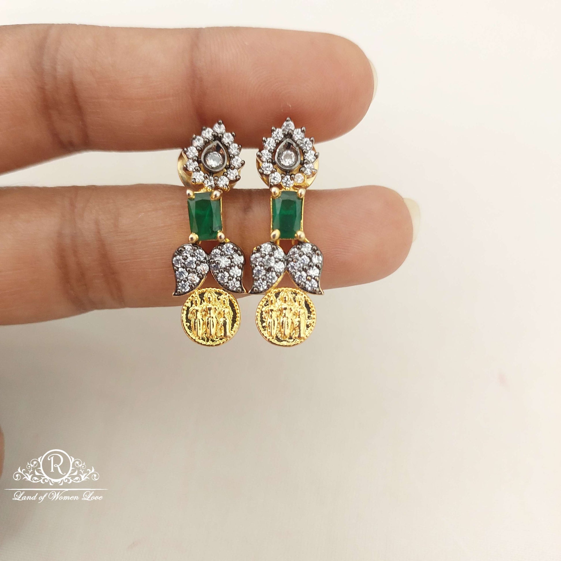 92.5 Silver Jewelry Beautiful Black Cz Stones Earrings Designs With 22k Gold Coating With Middle Green Stone With 1" Inches BackSide Screw Model.From Ramalacollections