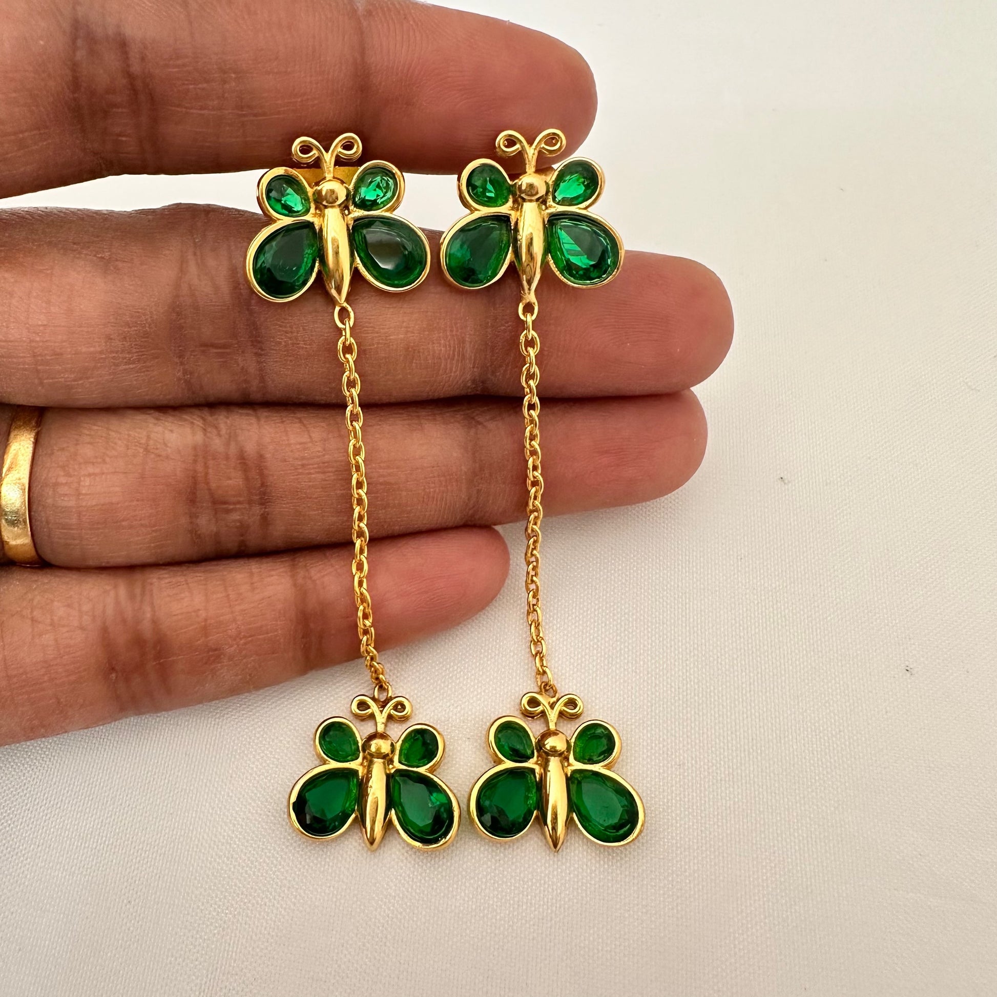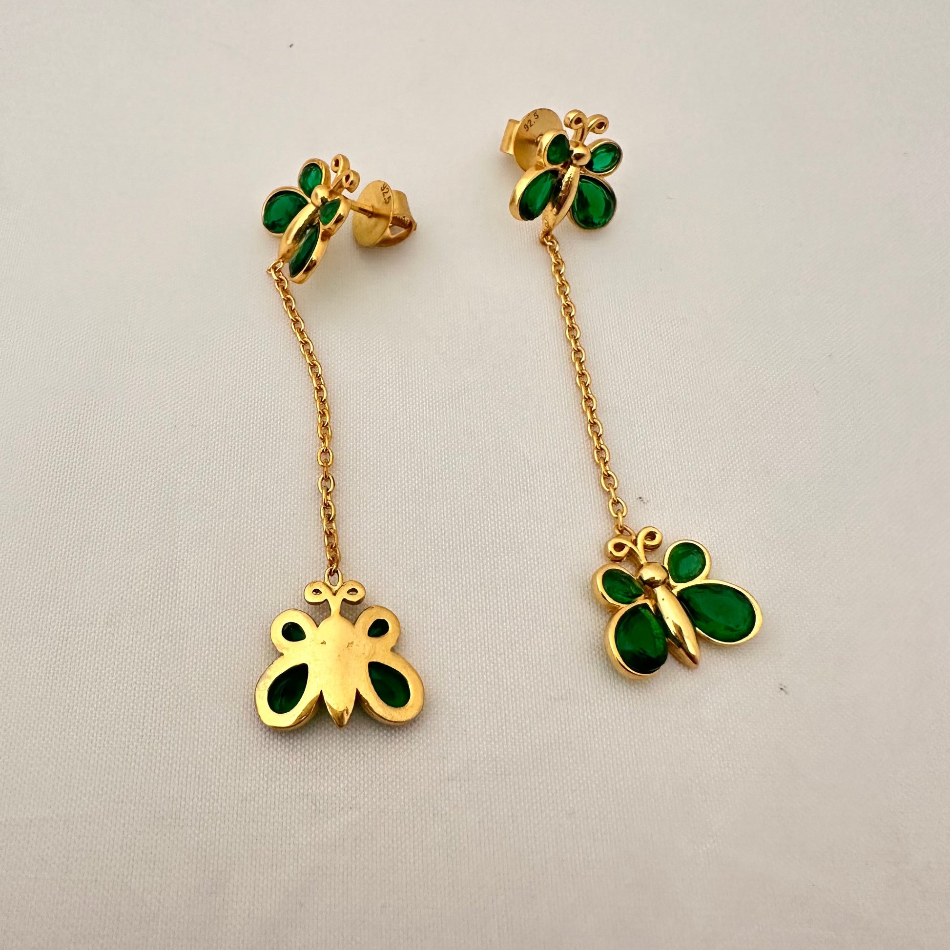 Silver base gold polish light weight butterfly earrings emrold stone butterfly’s hanging model design 2.5 inches length design by ramalacollections