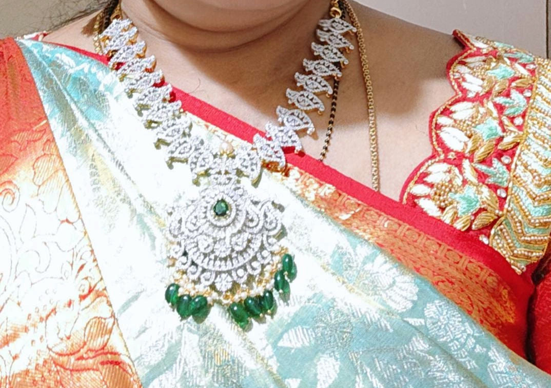 Silver base gold polish Cz stone lights weight necklace with green beads hanging 12 Inches length design by ramalacollections