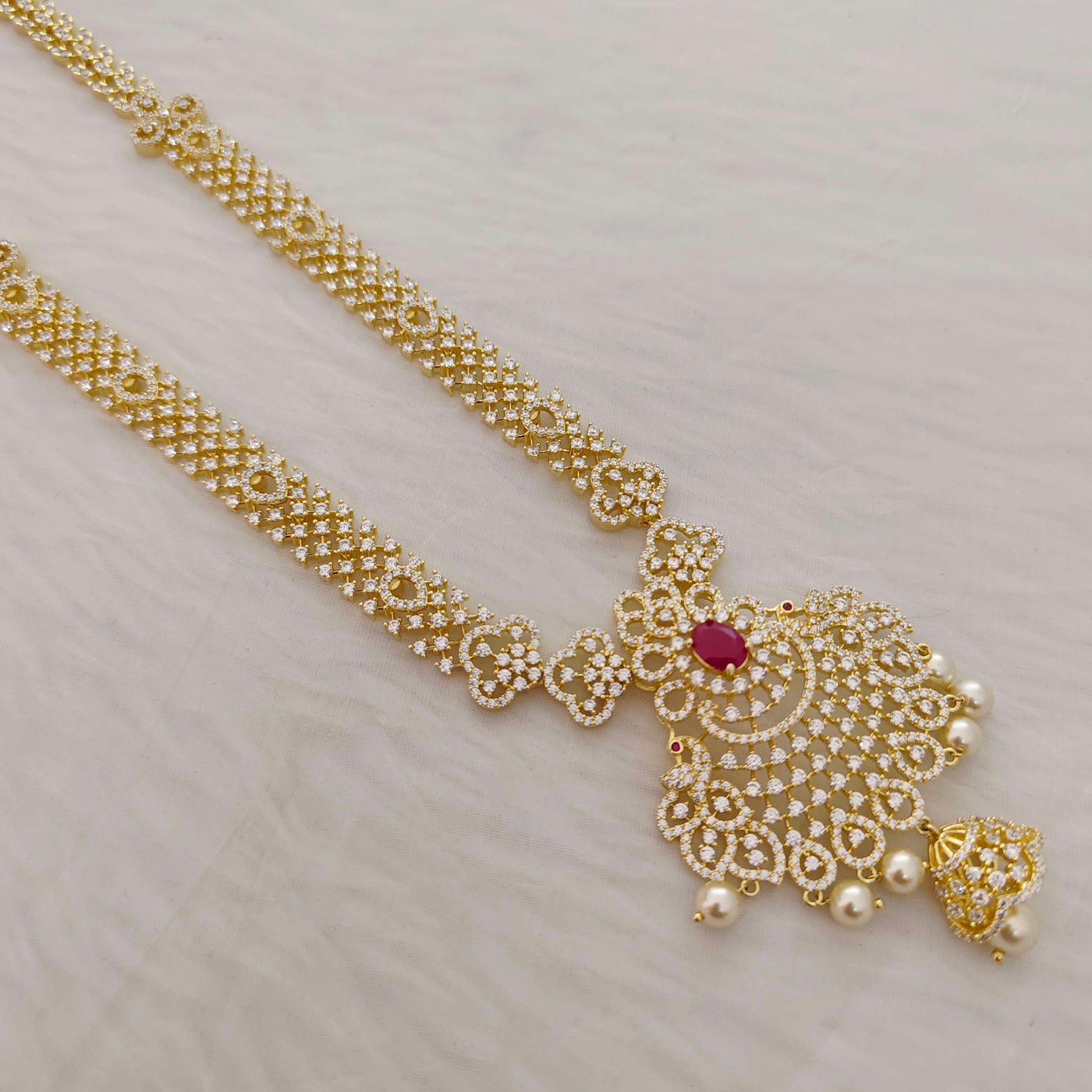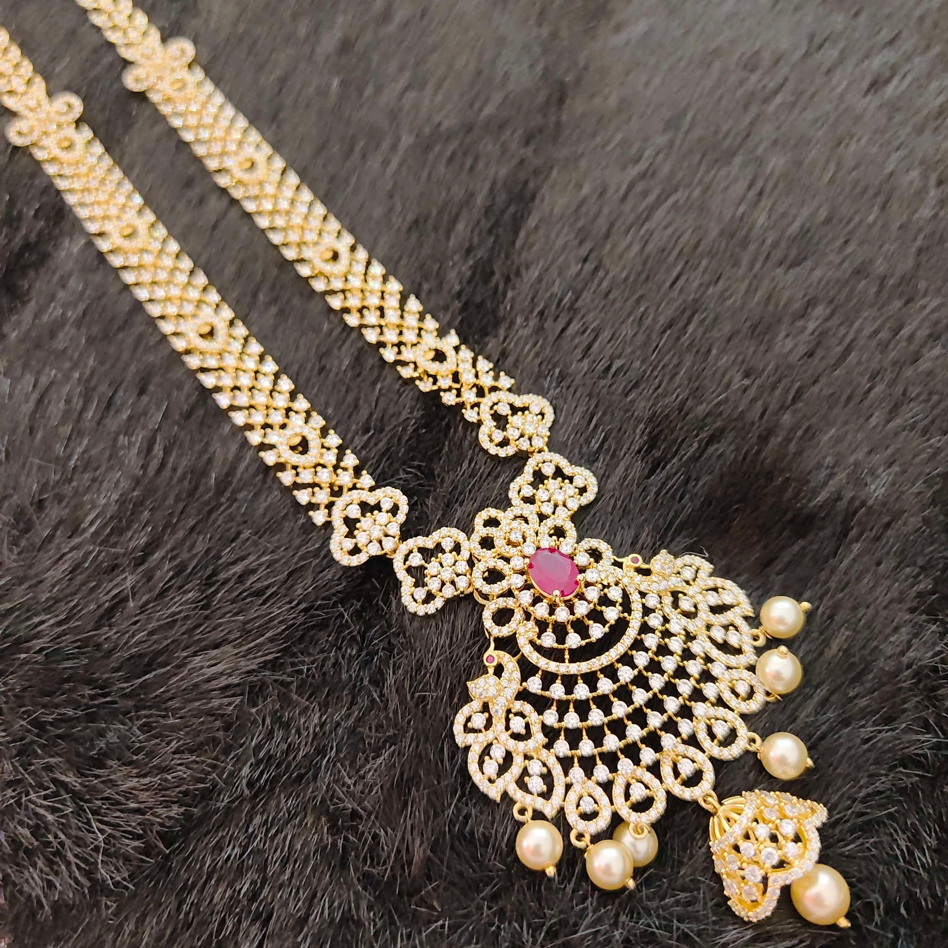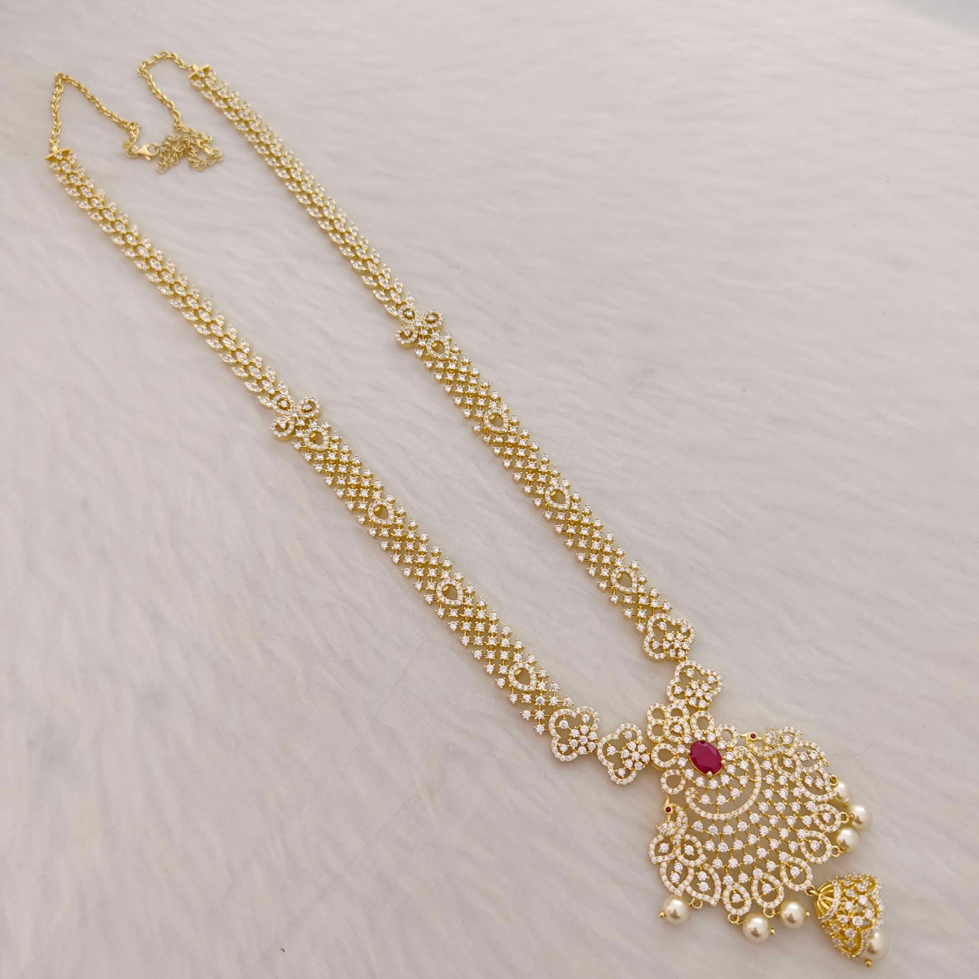 Silver base gold polish Cz stone haram design available 34 inches length design by ramalacollections