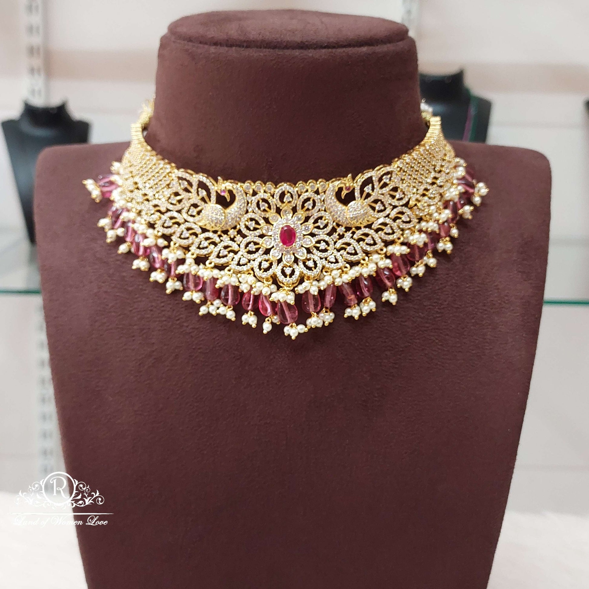 92.5 Silver Jewelry Beautiful Cz Stones Chocker Peacock Designs with White Stones Middle Kempu Stone With 22k Gold Coating Hanging pearls.From Ramalacollections