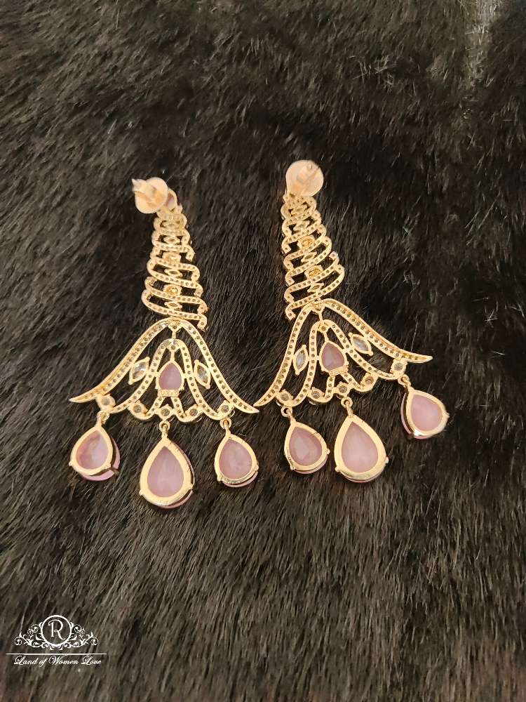 92.5 Silver Jewelry Beautiful Cz Stones With Dimond Design Necklace With Matching Earrings Designs With 22k Gold Coating With White Stones Middle Light Pink Stones Hanging Stones With 9" Inches .From Ramalacollections