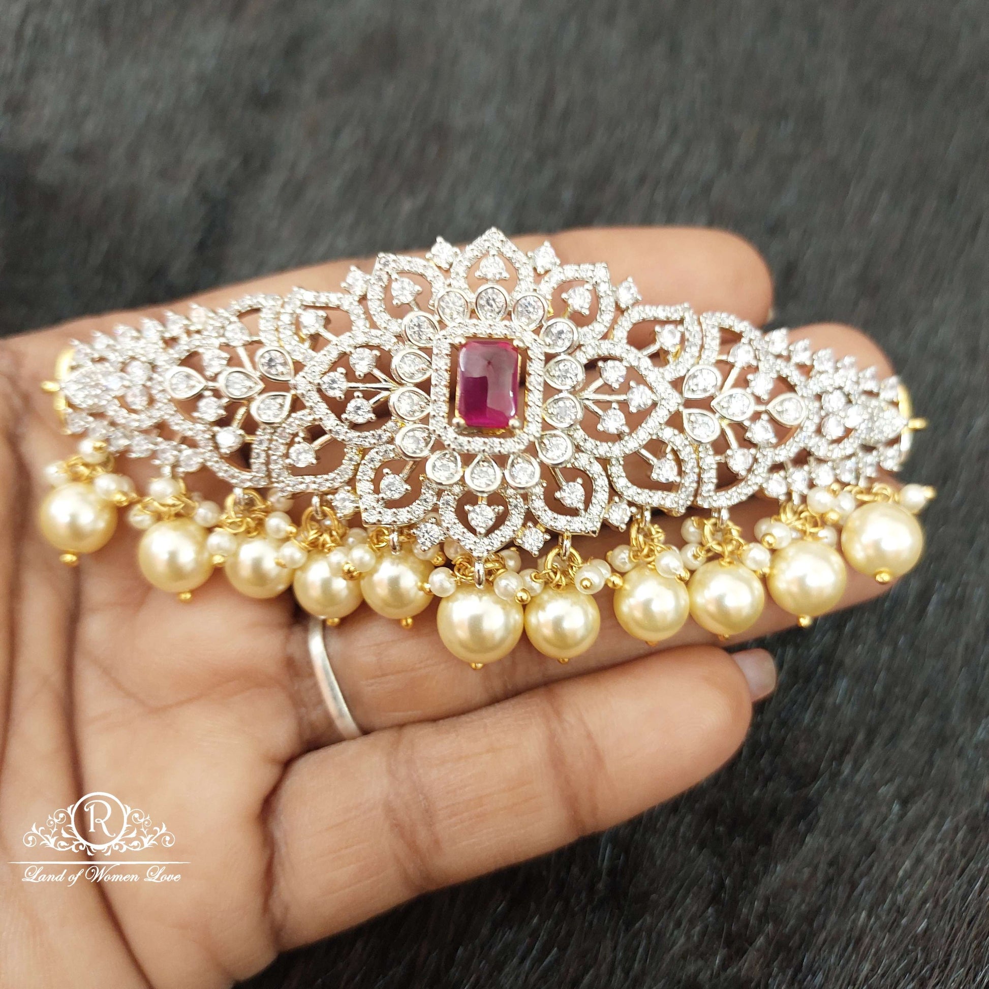 92.5 Silver Jewelry Beautiful Cz White Stones Chocker Designs With Middle Kempu Stone With 22k Gold Coating With Hanging Pearls 3.5" Inches. From Ramalacollections