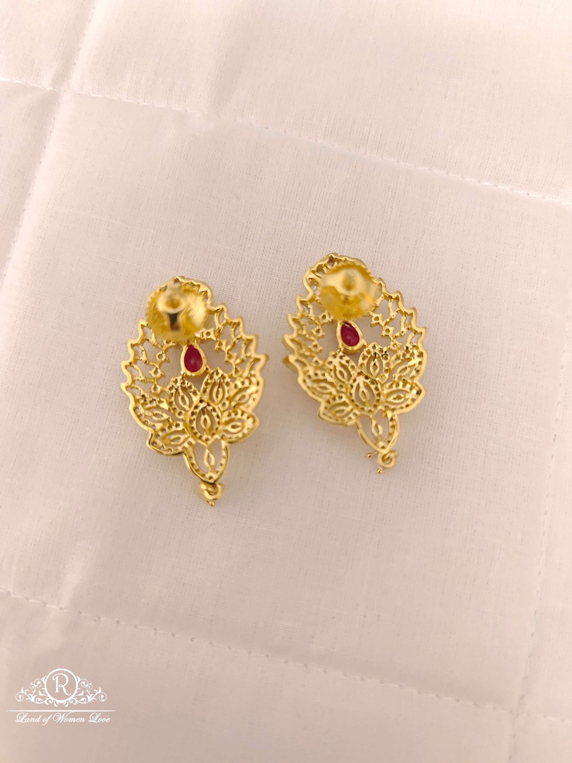 92.5 Silver Jewelry Beautiful Cz Locket Matching Earrings Flower Designs With 22k Gold Coating With White Stones Middle Kempu Stone With 2.5" Inches.From Ramalacollections