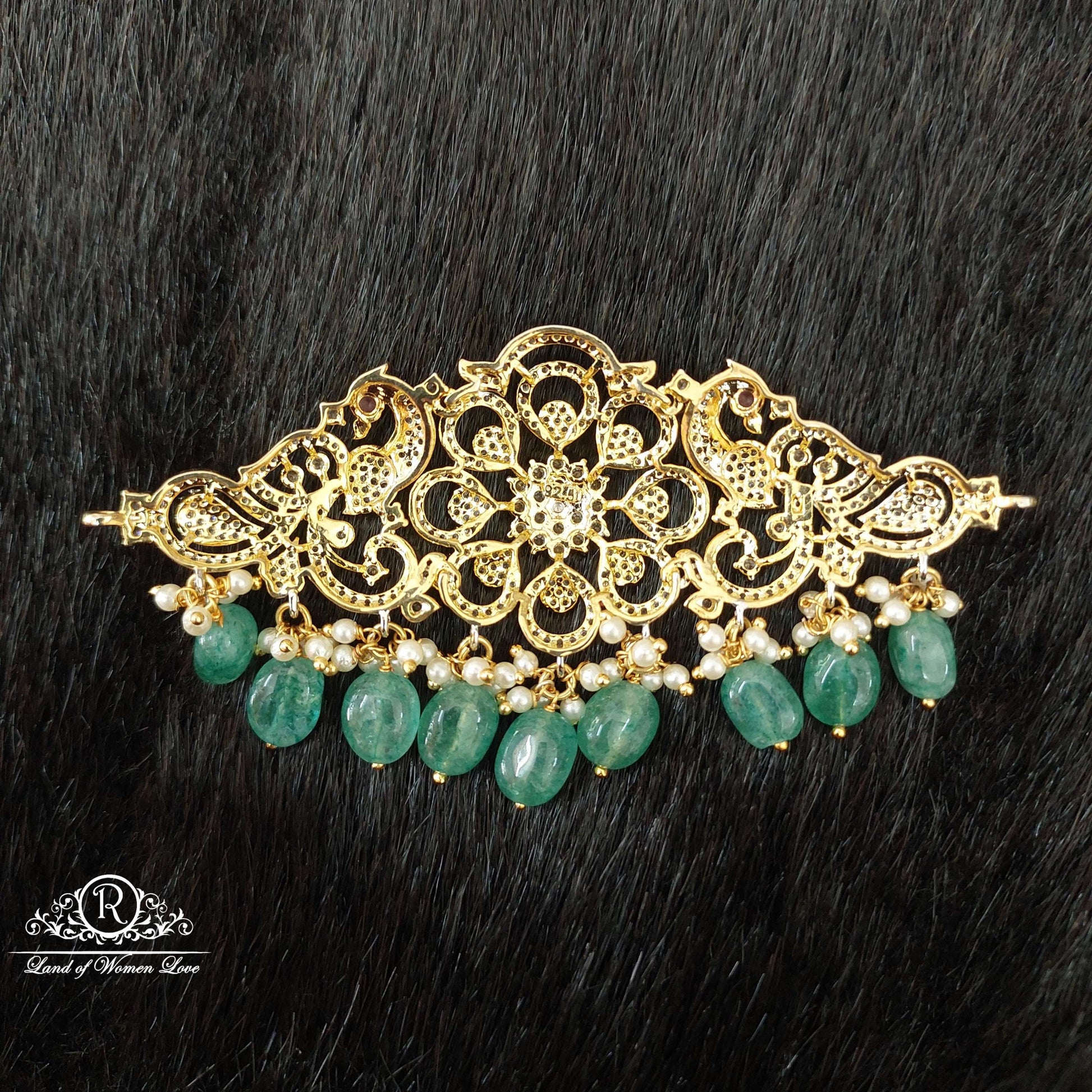 92.5 Silver Jewelry Beautiful Cz White Stones Chocker Peacock Designs With Middle Kempu Stone With 22k Gold Coating With Hanging Pearls 3" Inches. From Ramalacollections