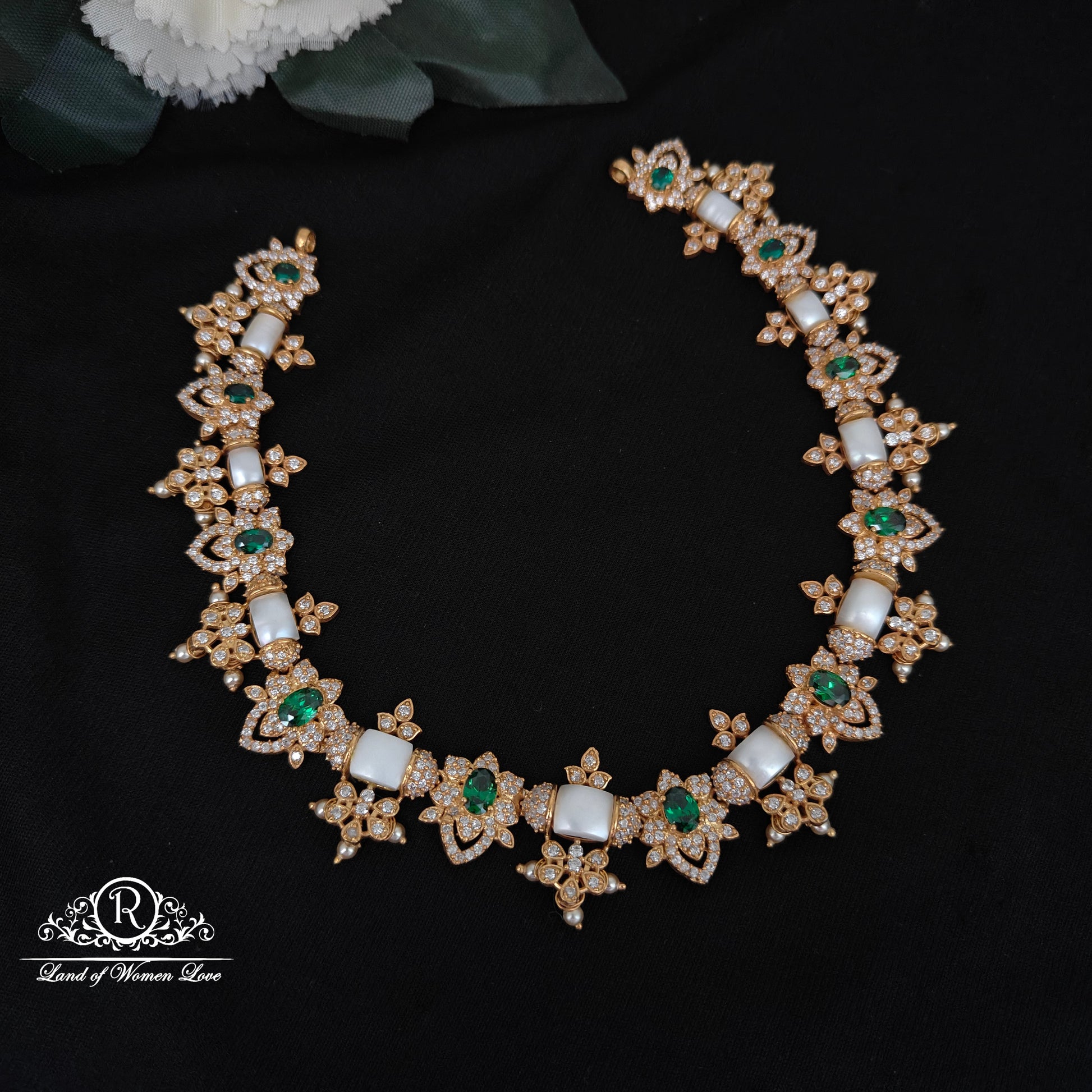 92.5 Silver Jewelry Beautiful Cz & Pearls with Green Stones Necklace Designs With 22k Gold Coating With 11" inches From Ramalacollections