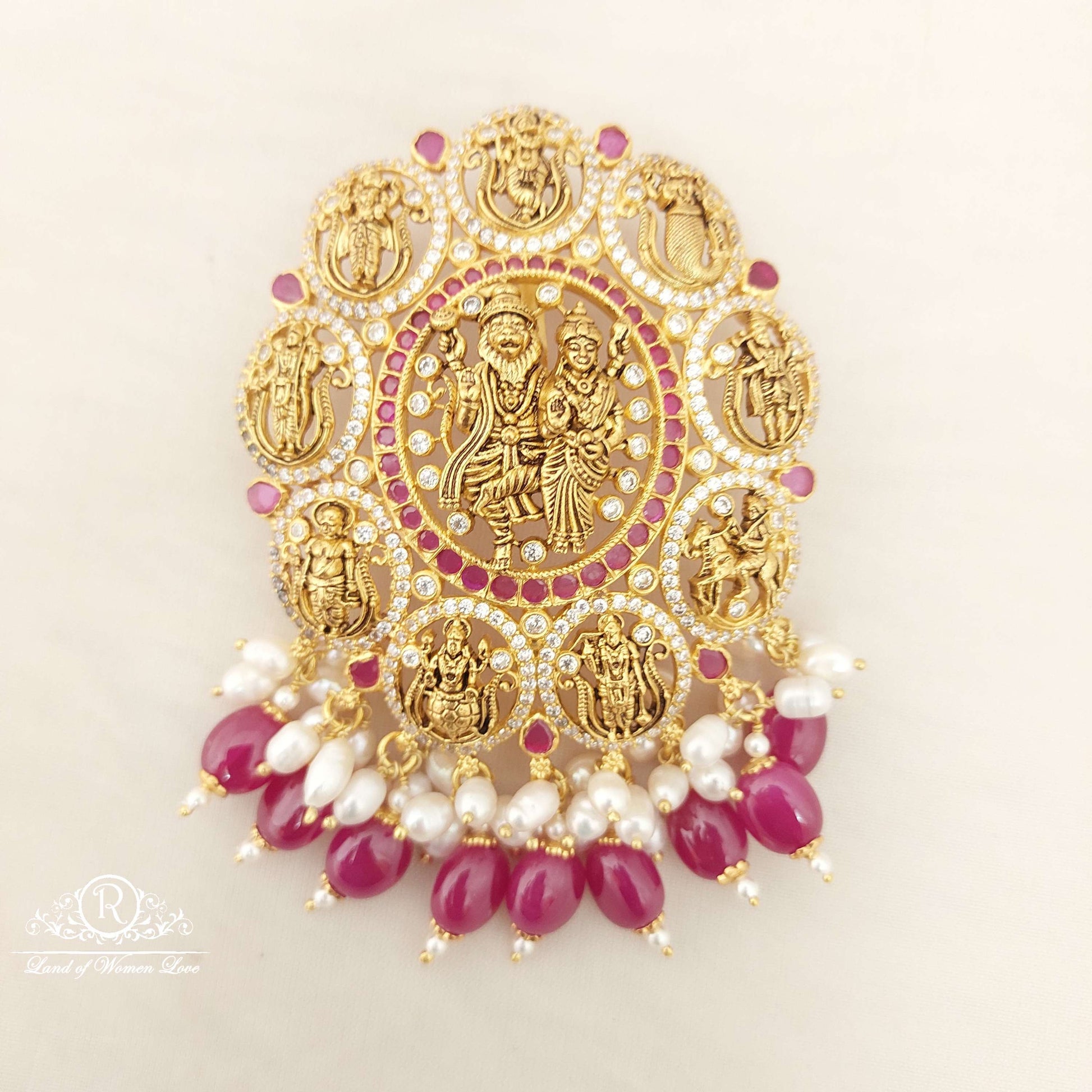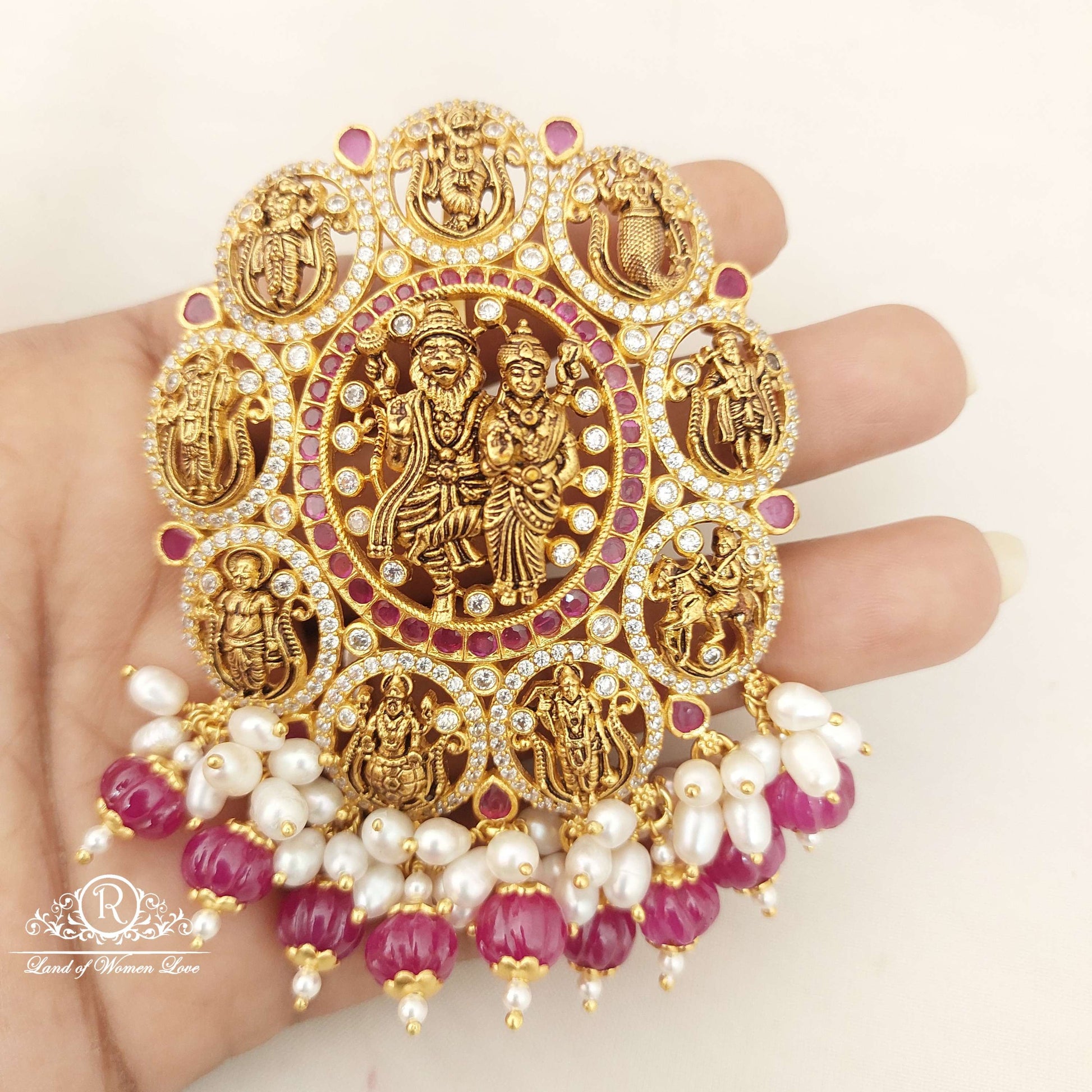 92.5 Silver Jewelry Beautiful Dasaavatharam Narasimha Swamy Locket Designs With 22k Gold Coating With White Stones Middle Kempu Stones With Hanging Pumpkin Beads & Pearls With 3" inches. From Ramalacollections
