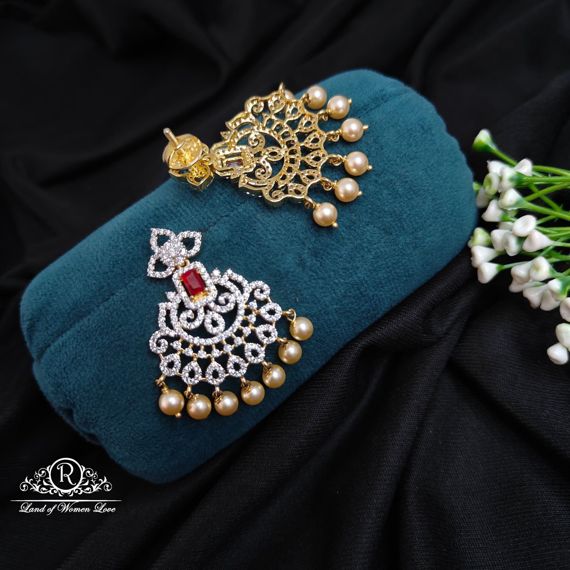 92.5 Silver with gold polish diamond replica ruby stone and pearls beads hanging bombay screw pattern earrings 2 inches length design by ramalacollections