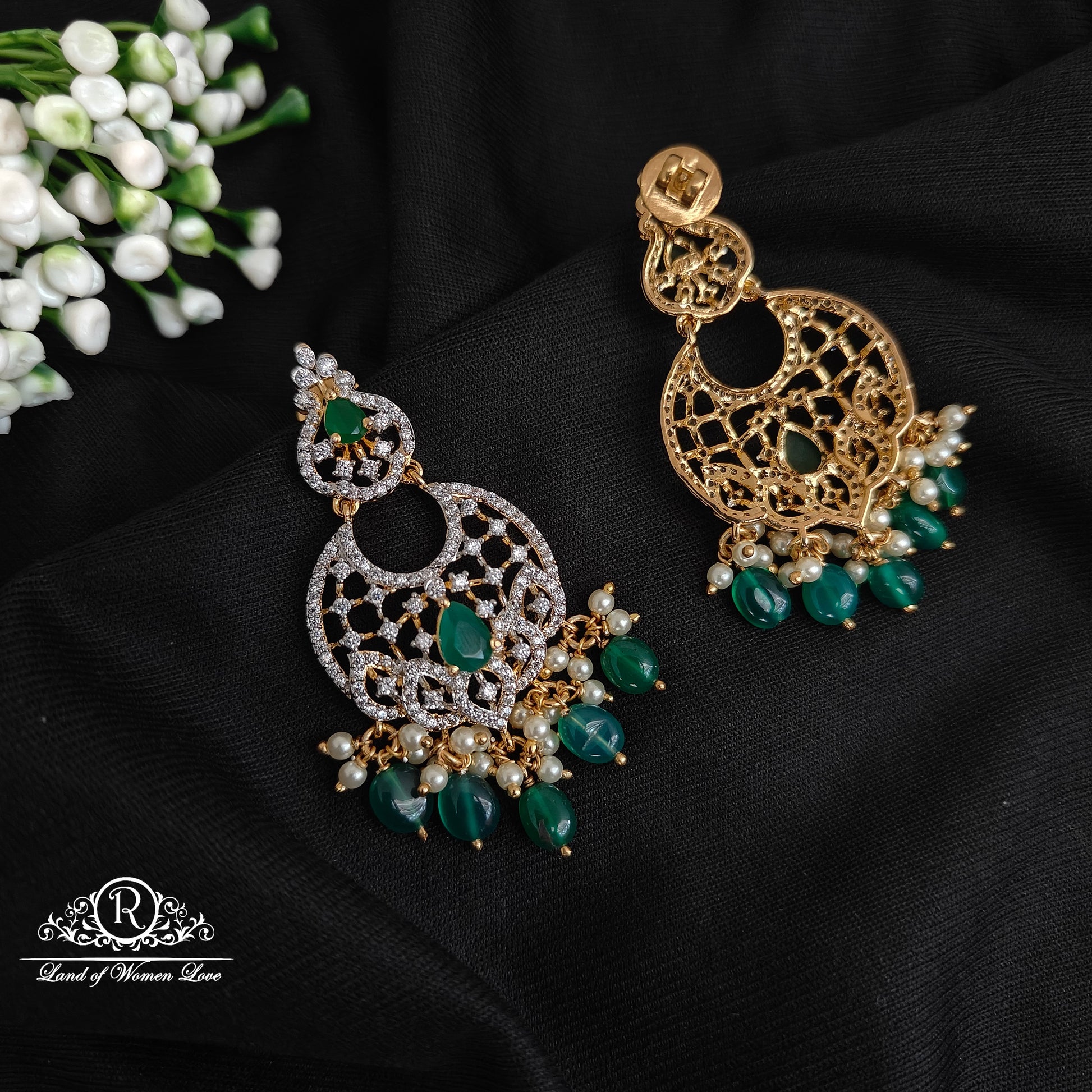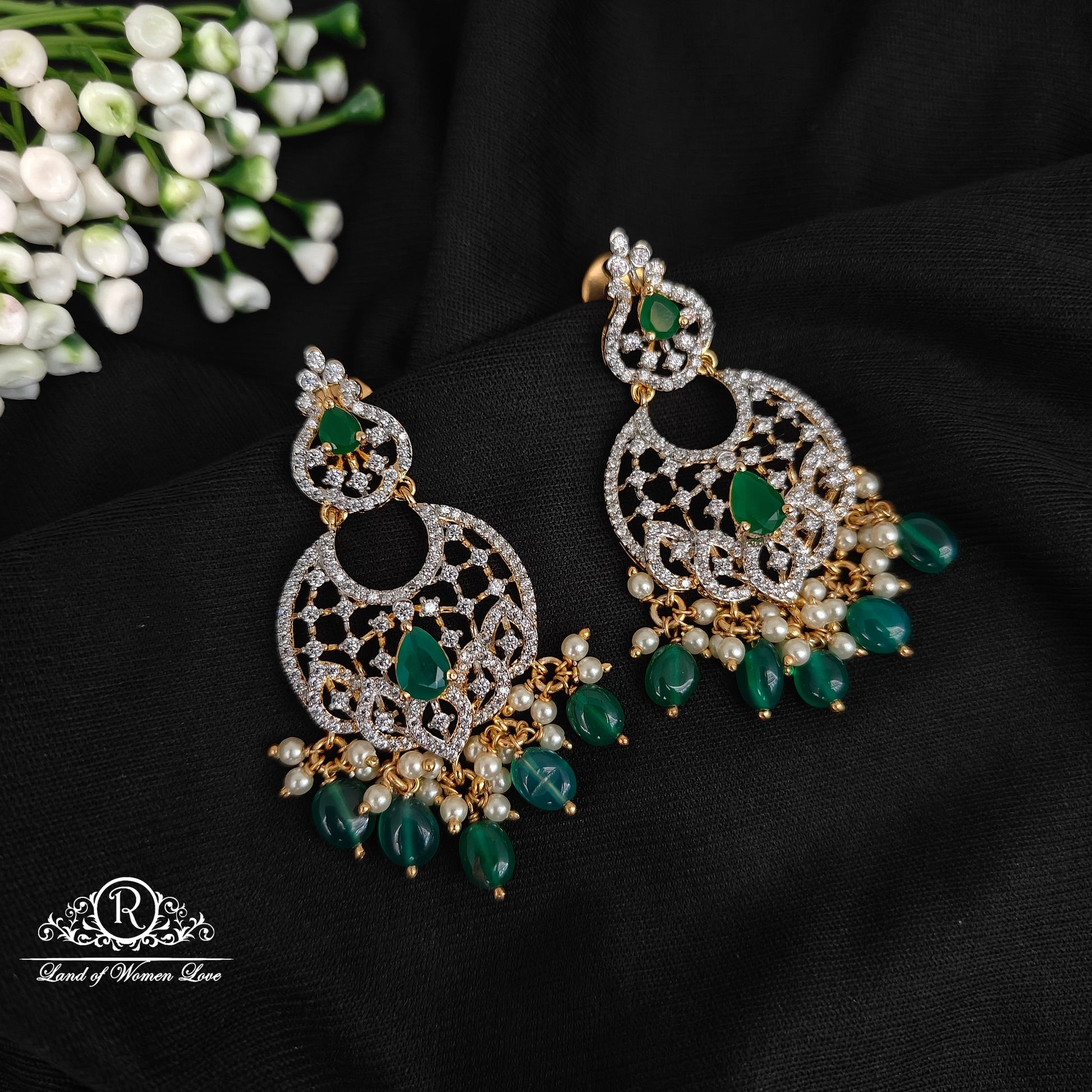 92.5 Silver with diamond finishing necklace green beadshamging with matching earrings also available 12 inches length design by Ramala collections