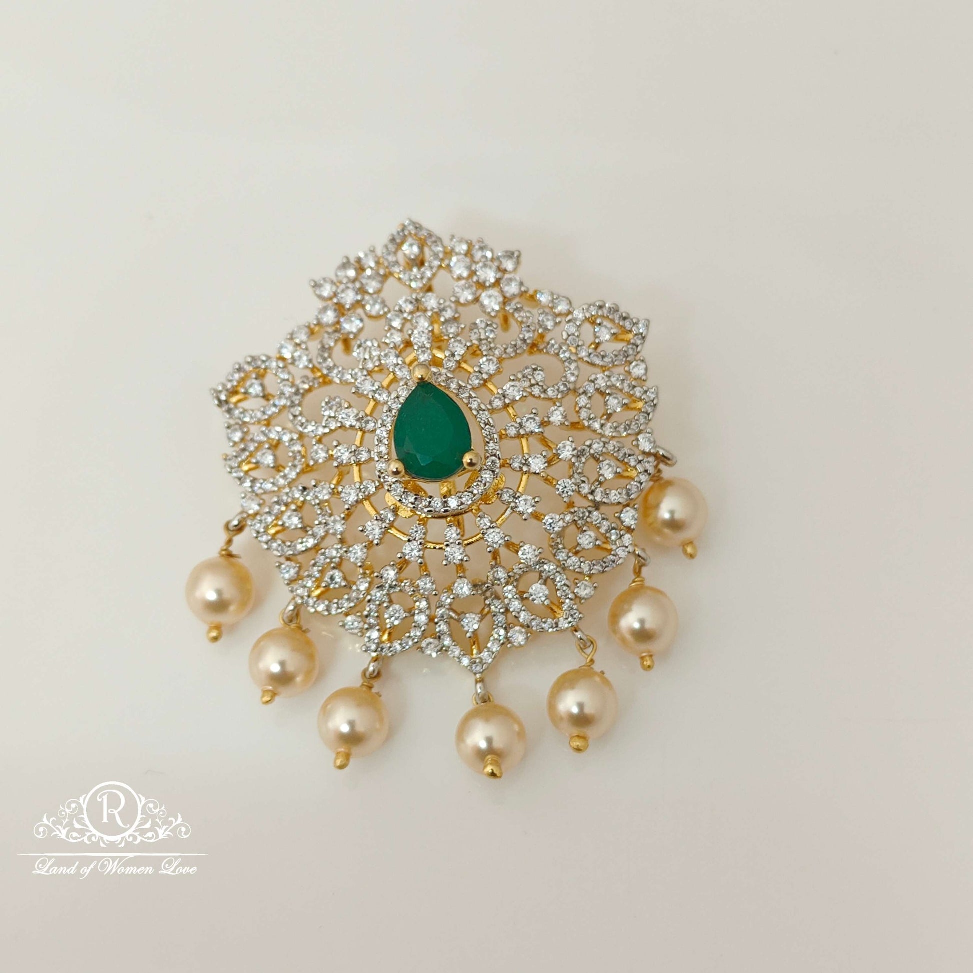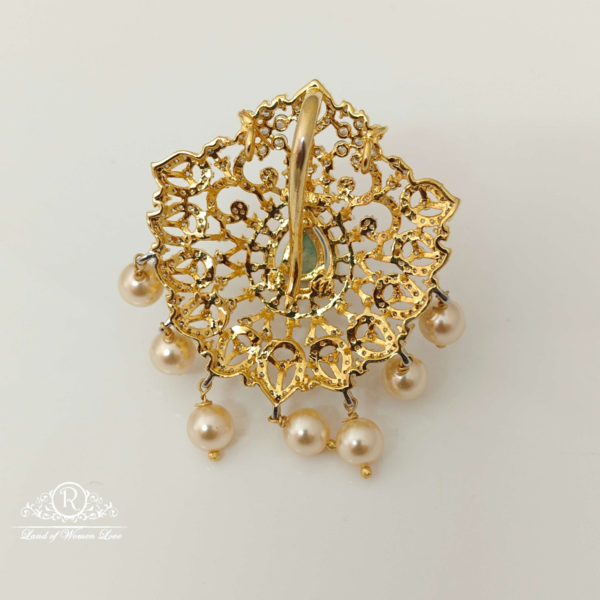 92.Silver base gold polish beautiful diamond replica design locket with white stones middle green stone with hanging pearls back side 3 rings 1.6 inches length by ramalacollections