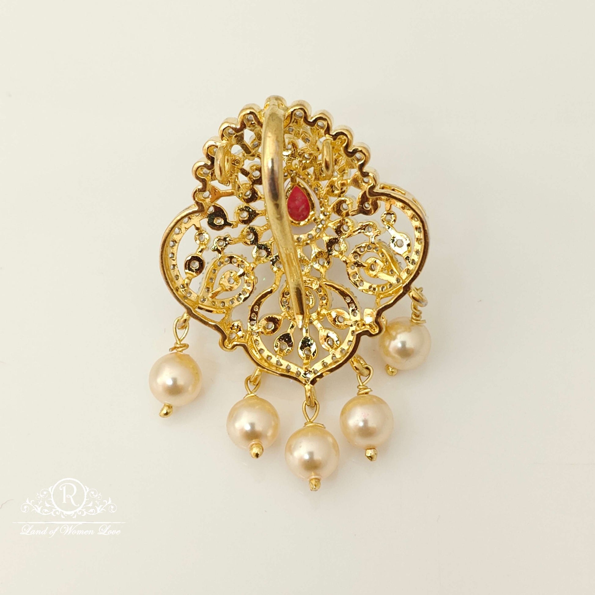 92.Silver base gold polish beautiful diamond replica design pendant with cz white stones middle kempu stone with hanging pearls back side 3 rings 1.6 inches length by ramalacollections