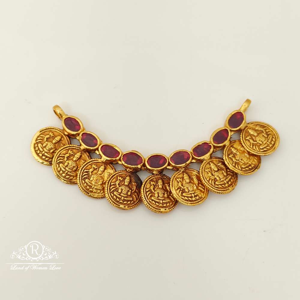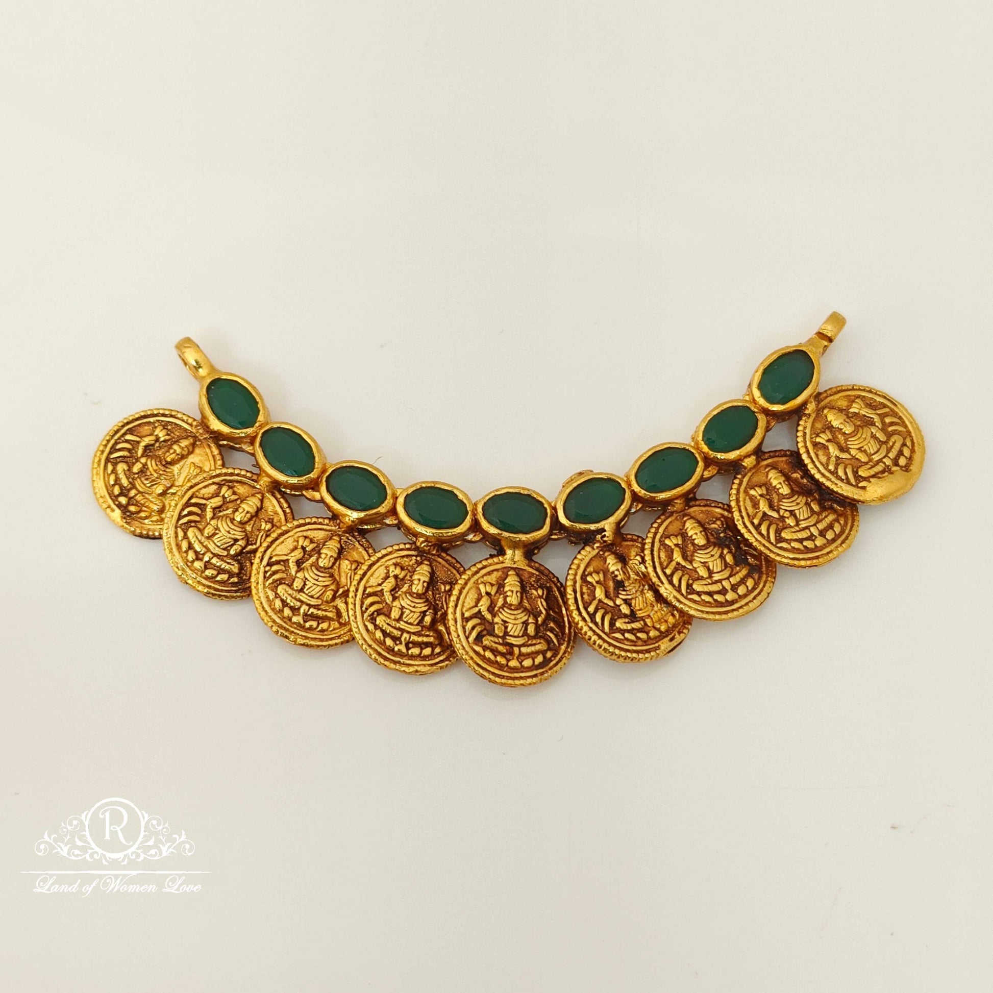 92.5 Silver base gold polish beautiful double side stones lakshmi devi kasula design mala locket with green & kempu stones 3 inches length by ramala collections