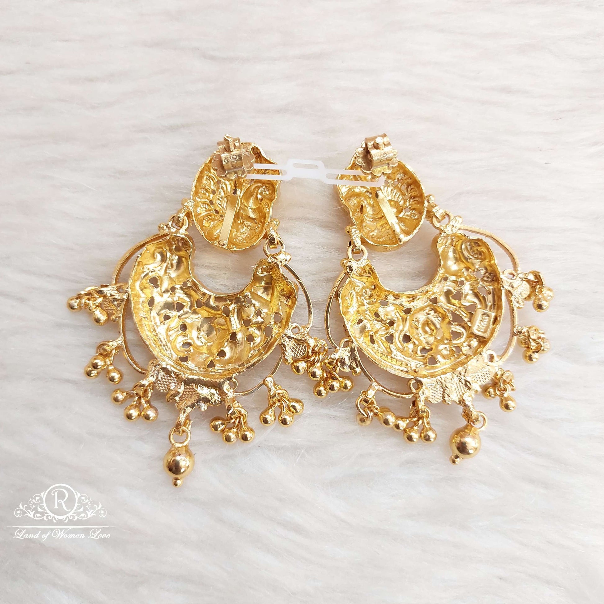 92.5 Silver Jewelry Beautiful Earrings Chandabali peacock Designs With Kempu& Green Stones With 22k Gold coating Hanging Silver Gold Balls with Back said screw design. From Ramalacollections