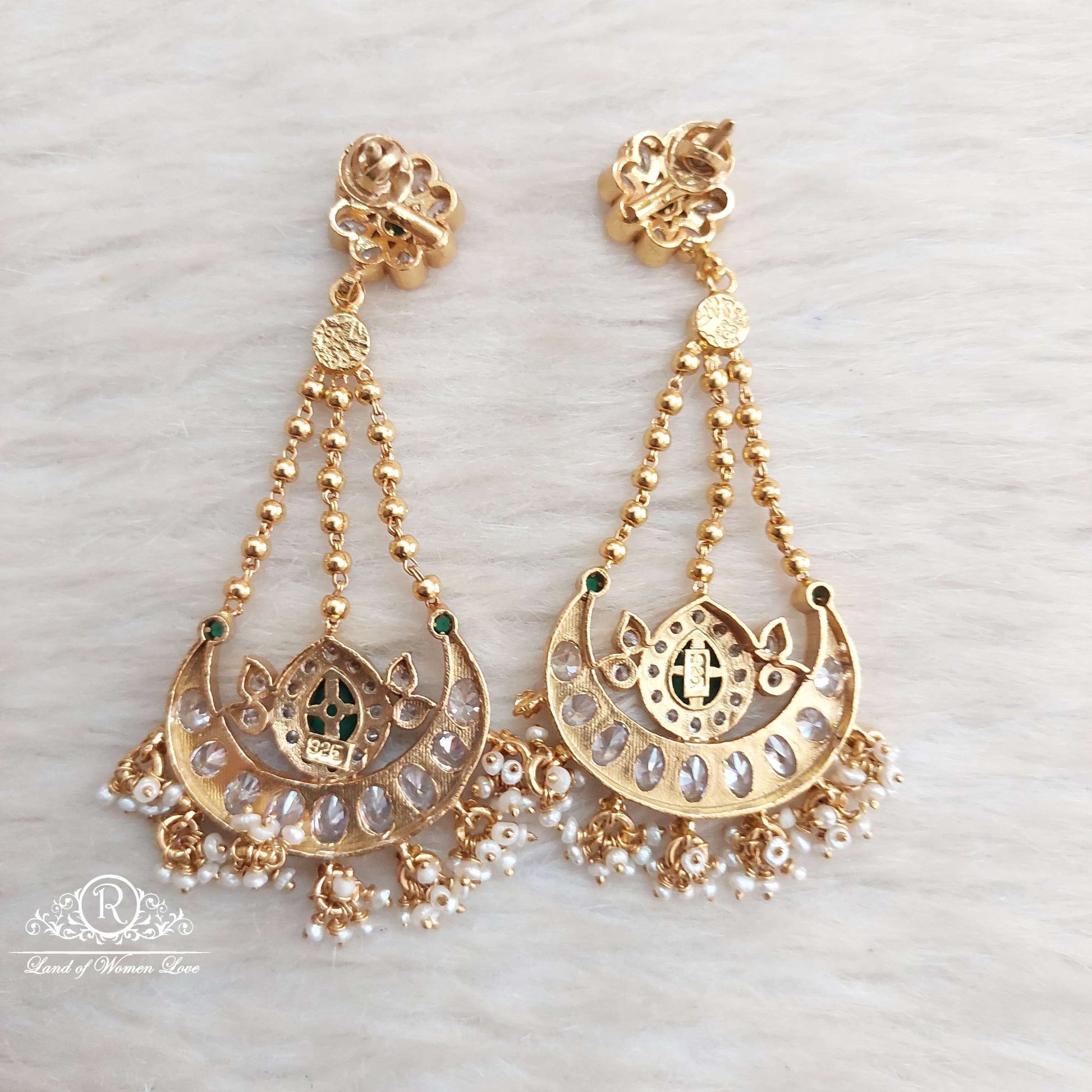 92.5 Silver Jewelry Beautiful Long Hanging Type Earrings Designs With 22k Gold coating With White Stones middle Green stone. Back side screw model Hanging Pearls With 3" Inches. From Ramalacollections