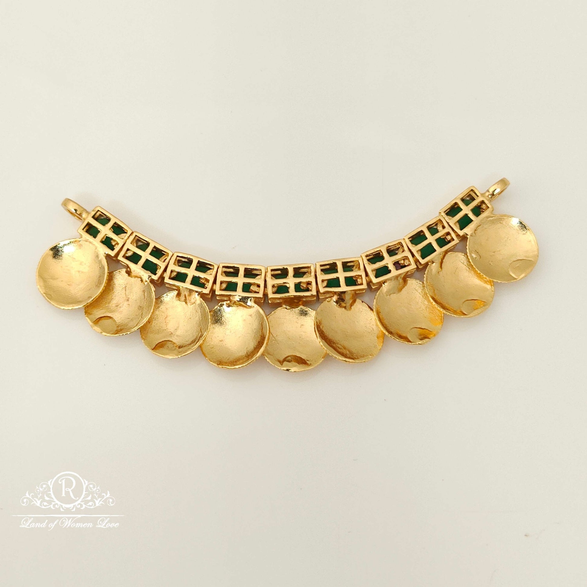 92.5 Silver base gold polish beautiful lakshmi devi kasula design mala locket with green 💚 stones 3 inches length by ramala collections