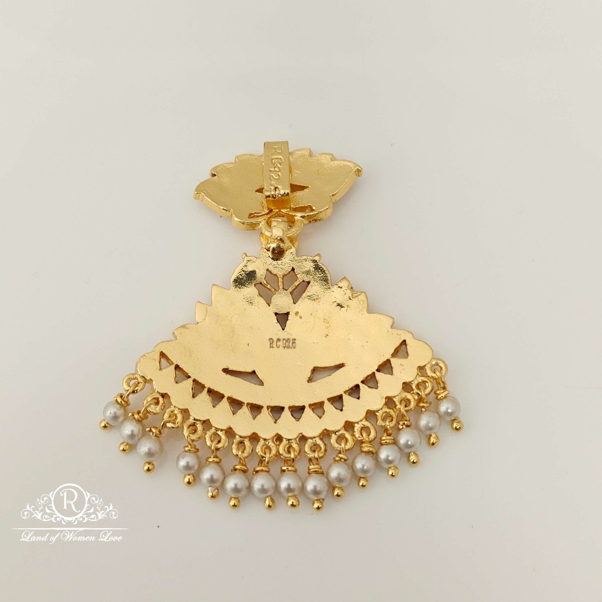 92.Silver base gold polish beautiful hand made Stting design locket peacock model with white stones middle kempu stone hanging pearls with 2" inches length by ramalacollections