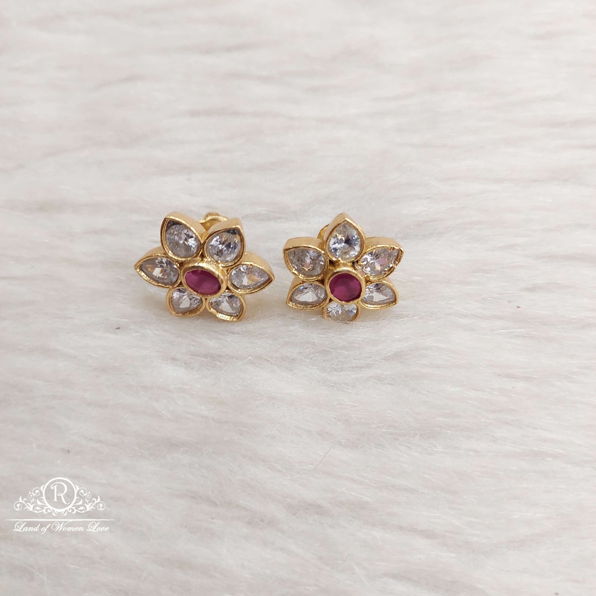 92.5 Silver Jewelry Beautiful Stud Earrings Flower Designs With 22k Gold coating With White Stones middle Kempu stone. Back side screw model.From Ramalacollections