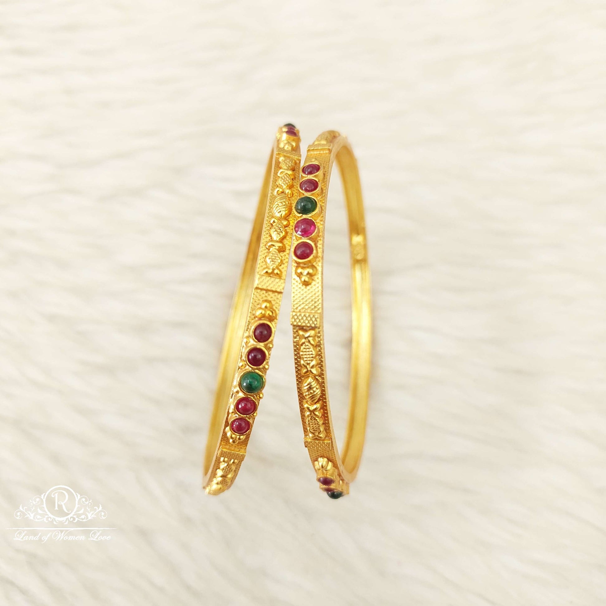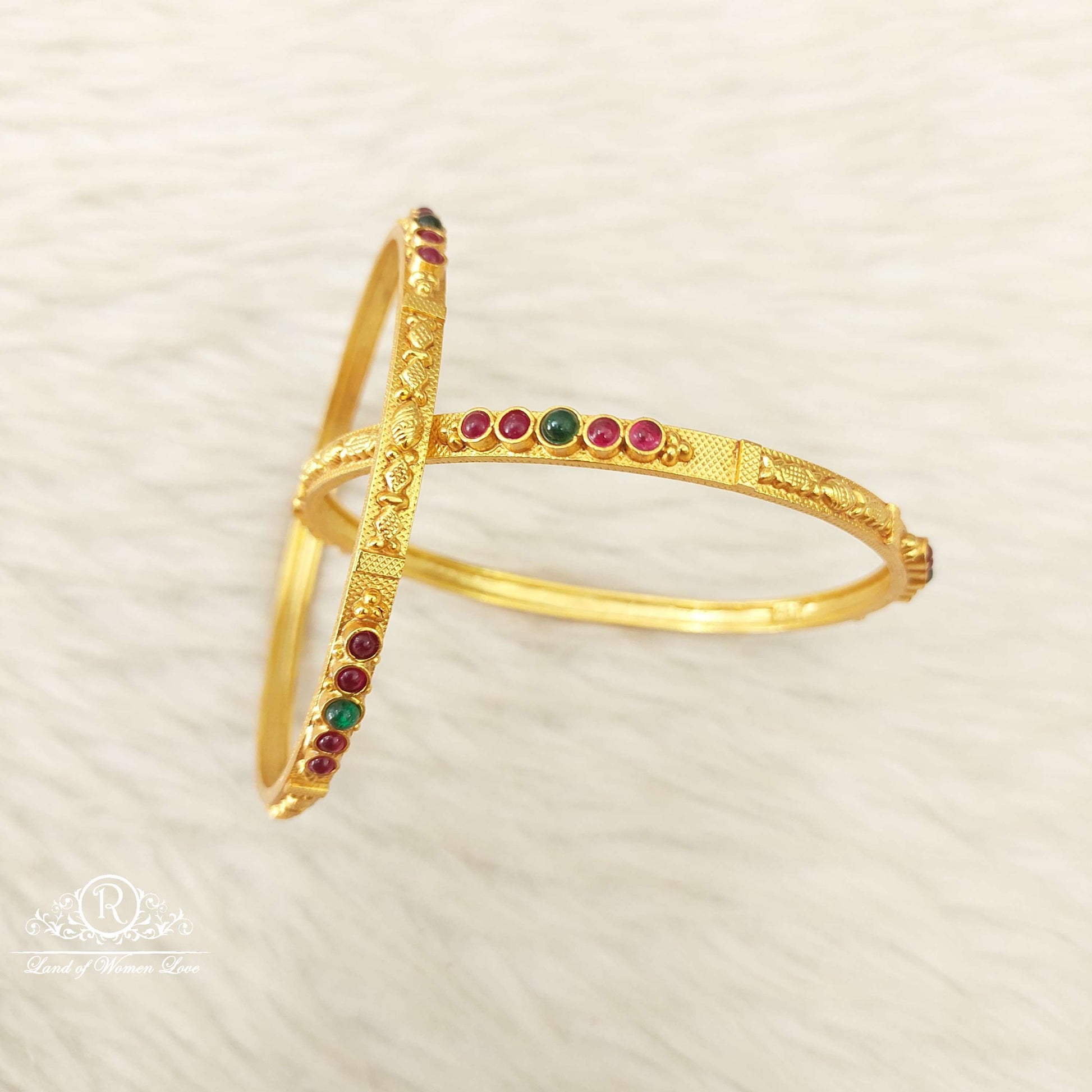 92.5 Silver Jewelry Beautiful Bangles Designs With 22k Gold Coating With Middle Green & Kempu Stones With 2.5 Size. From Ramalacollections