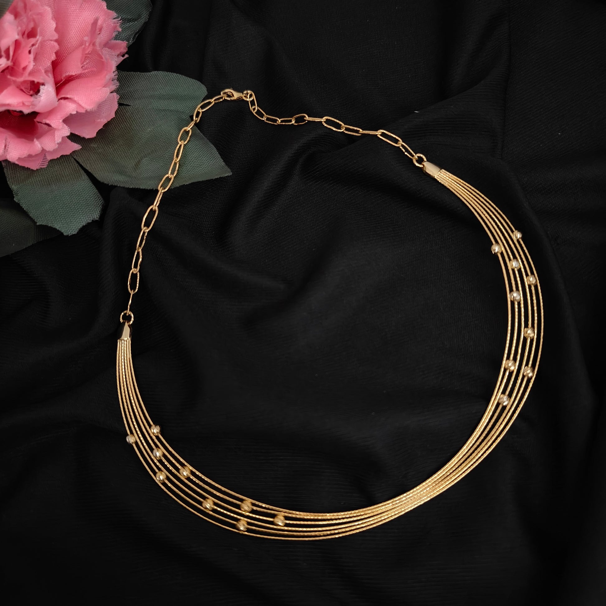 Minimalism meets elegance with this stunning multi-layer gold-tone necklace. Featuring five sleek strands adorned with delicate gold beads and a chic adjustable chain link, this design adds effortless sophistication to any look. Lightweight and versatile, it's the perfect accessory for both casual and formal occasions.