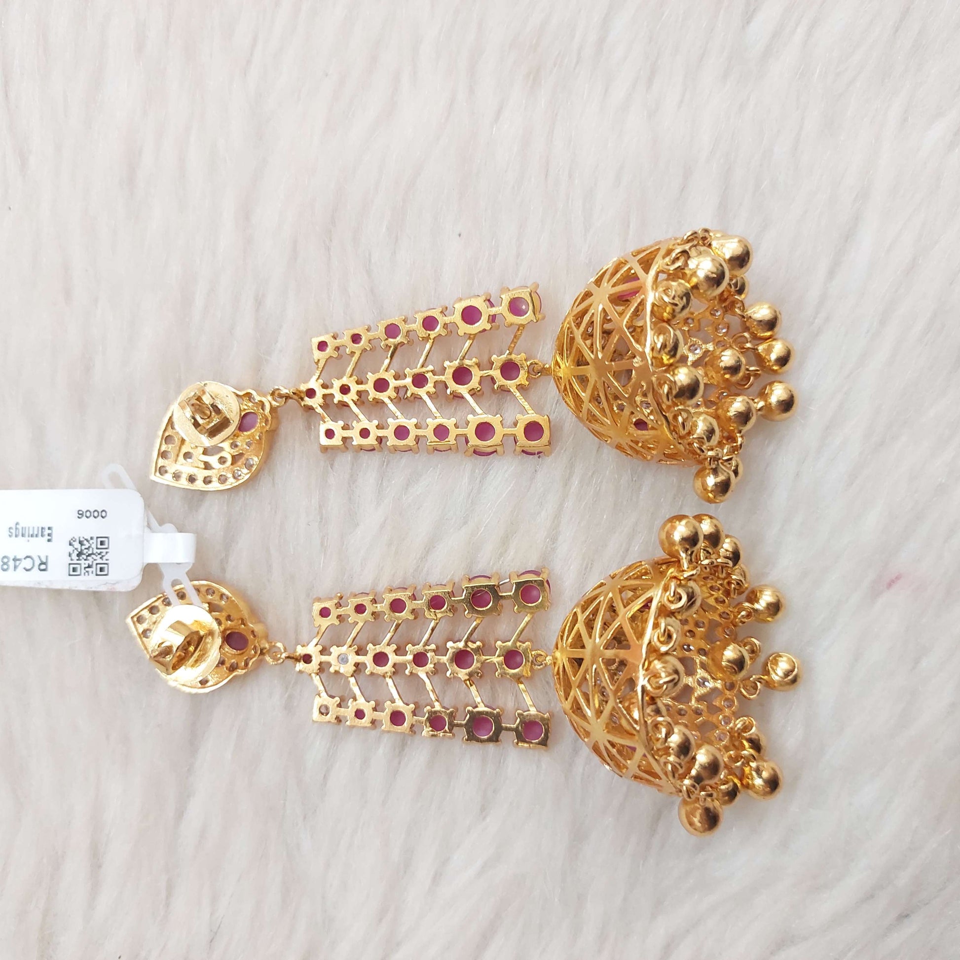 92.5 Silver jewellery Beautiful Long Jumka Earrings Designs with 22k Gold coating with Kempe and white Stones with Back said screw design with Hanging Silver Gold Balls. From Ramalacollections