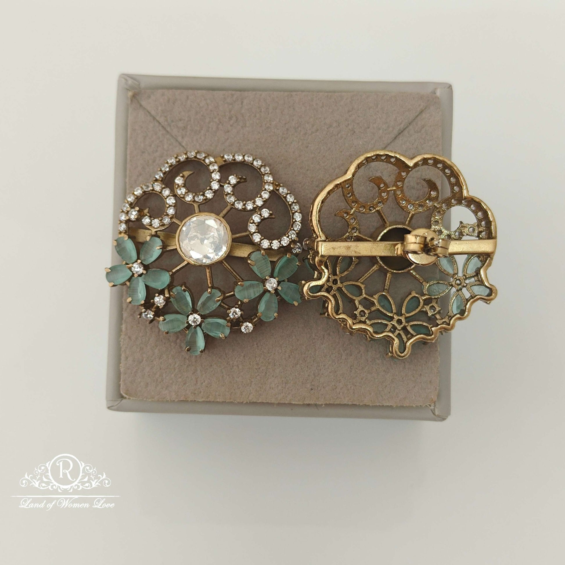 92.5 Silver base gold polish beautiful moissanite stud flower design earrings with white stones middle green stone with back side screw model 1 inche length by ramalacollections