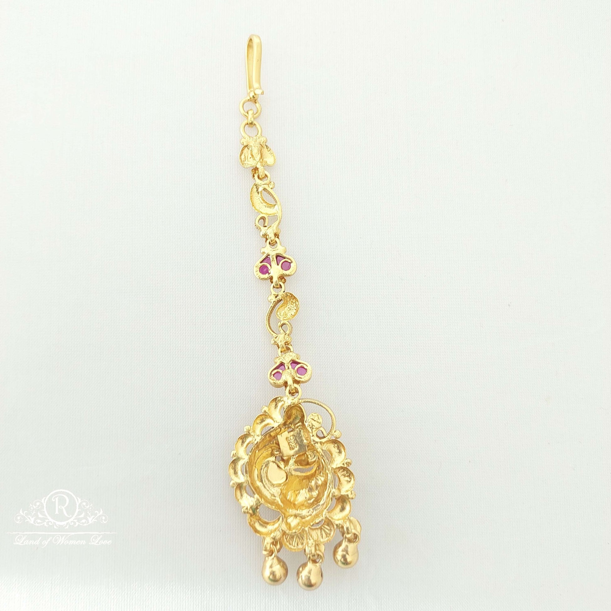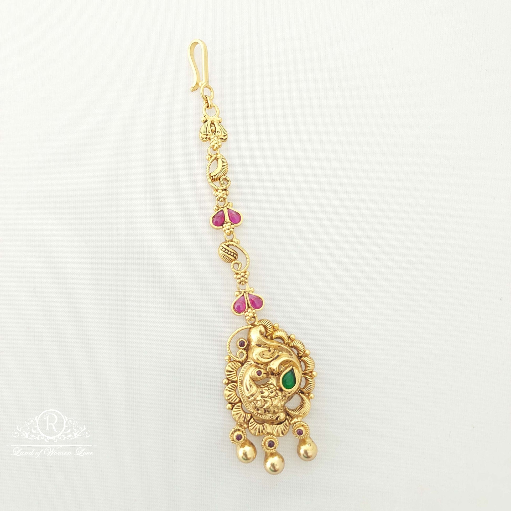 92.5 Silver Jewelry Beautiful Nakshi Model Tikkas Peacock Designs With kempu & Green Stones With 22k Gold antic finish With 5" Inches Hanging Silver Gold Balls. From Ramalacollections