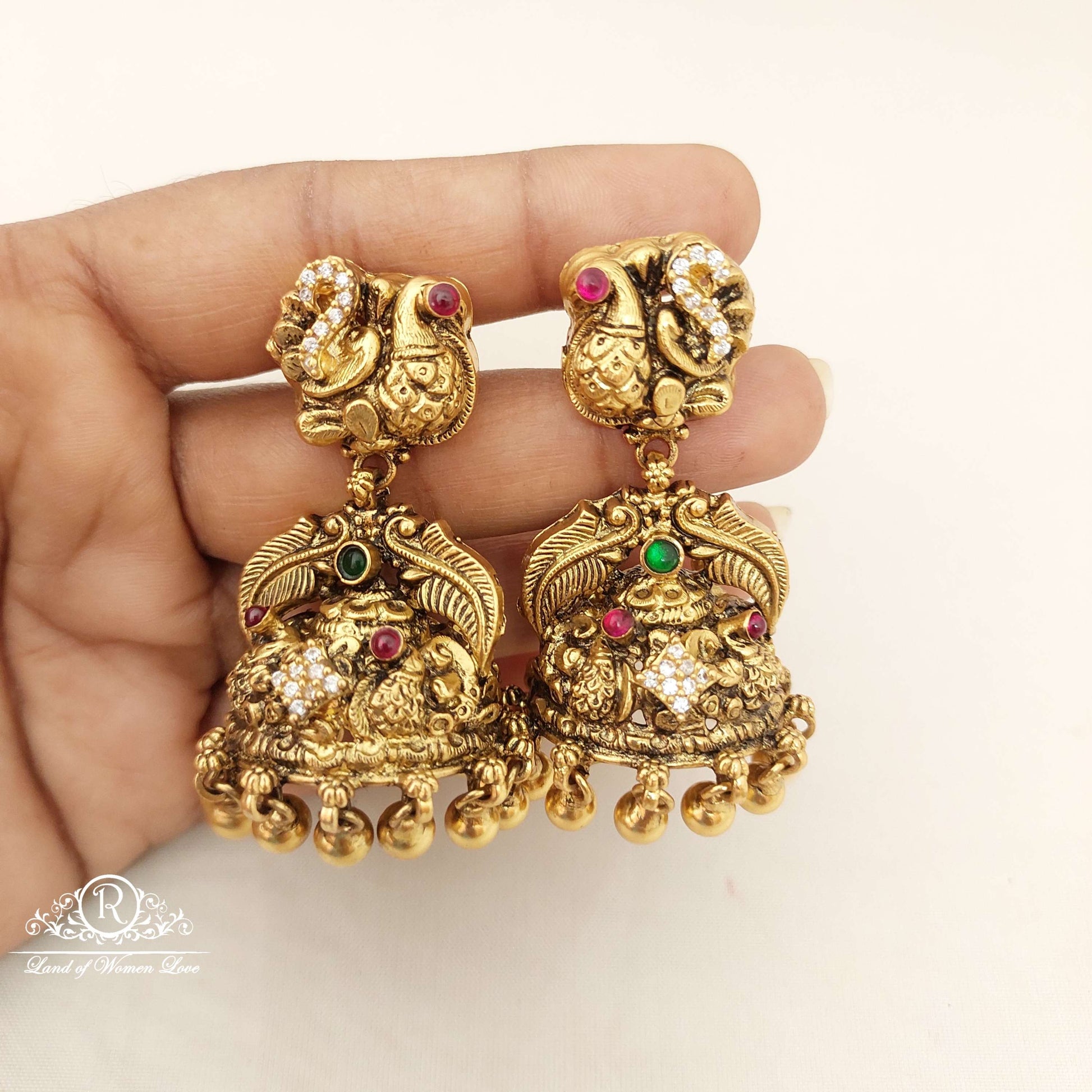 92.5 Silver Jewelry Beautiful Peacock jhumka Earrings Designs With 22k Gold Coating & Black Polish With Middle Kempu & White Stones With Hanging Silver Gold Balls With 2" Inches BackSide Screw Type. From Ramalacollections