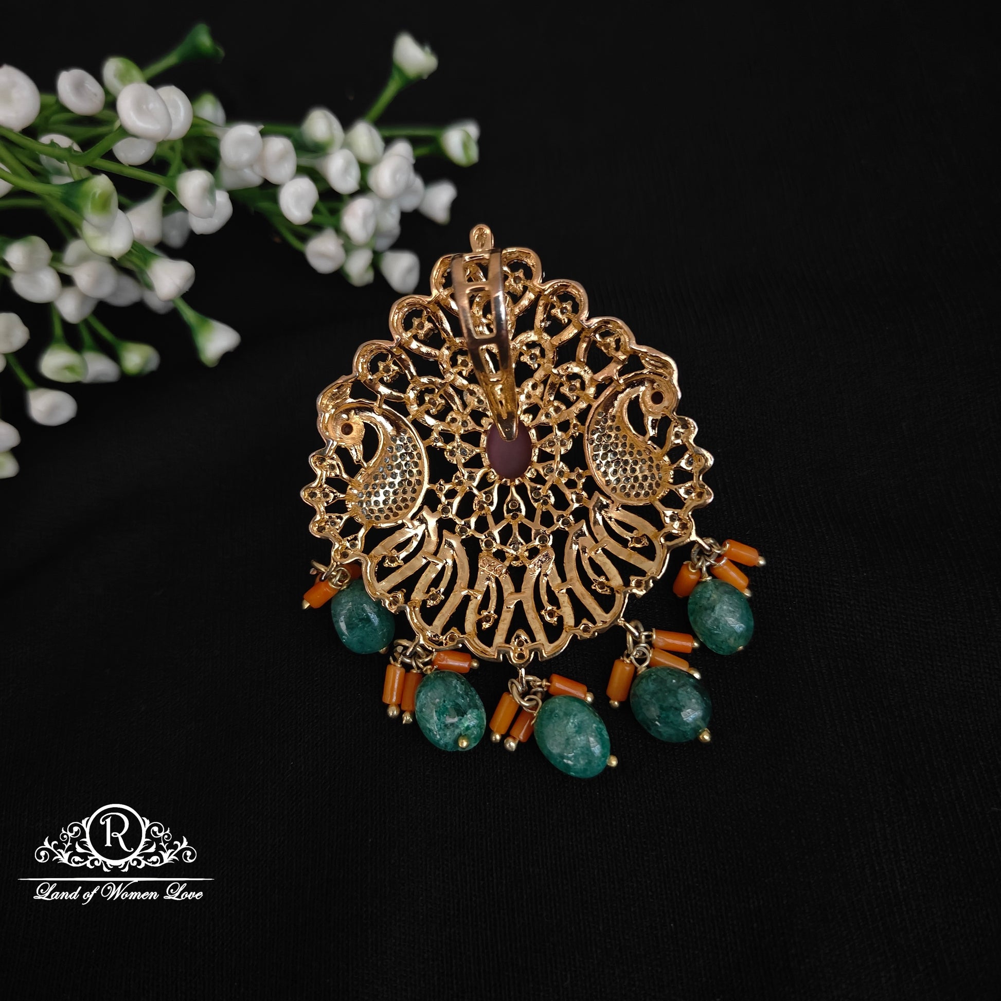 92.5 Silver with gold polish peacock design diamond finishing pendant with coral and Green beads hanging 2.3 inches length design by Ramala collections
