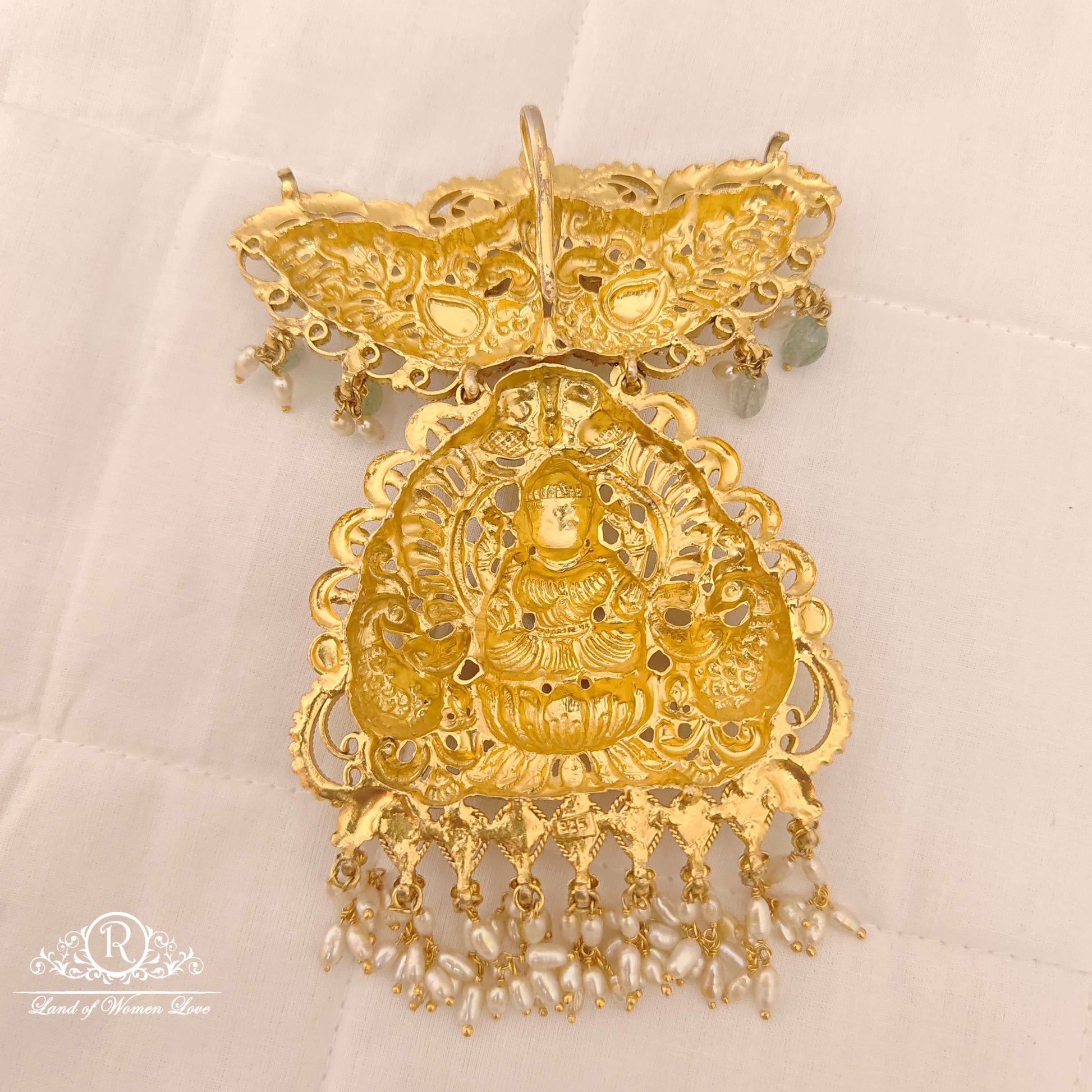 92.5 Silver Jewelry Beautiful Peacock Lakshmi Devi Locket Designs With 22k Gold Coating With Middle Green & Kempu Stones With Hanging Pearls With 4.5" Inches . From Ramalacollections