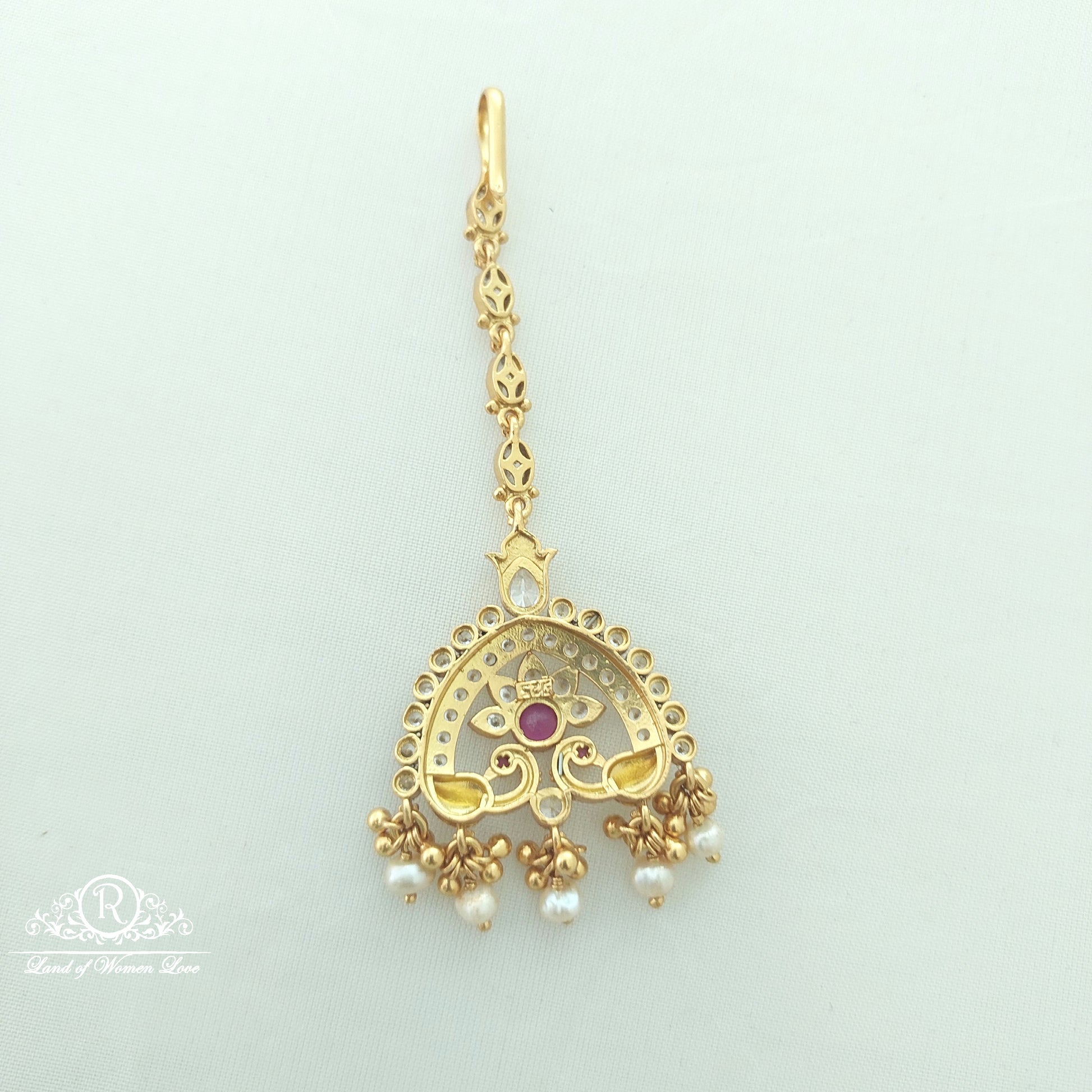 92.5 Silver Jewelry Beautiful Tikkas Peacock Designs With White Stones Middle Kempu Stones With 22k Gold coating With 3.4" Inches Hanging Silver Gold Balls & Pearls. From Ramalacollections