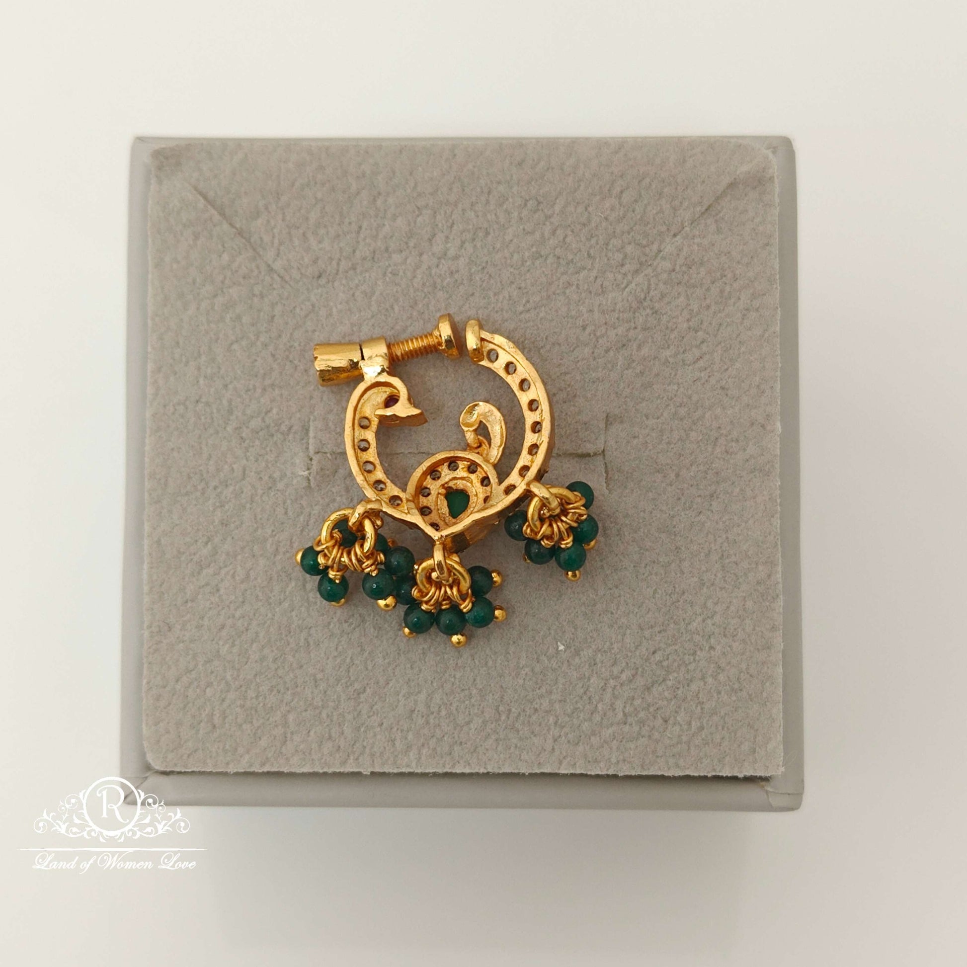 92.5 Silver base gold polish Nose pin peacock Design with white & green stones hanging green beads model 1 inches length by ramalacollections