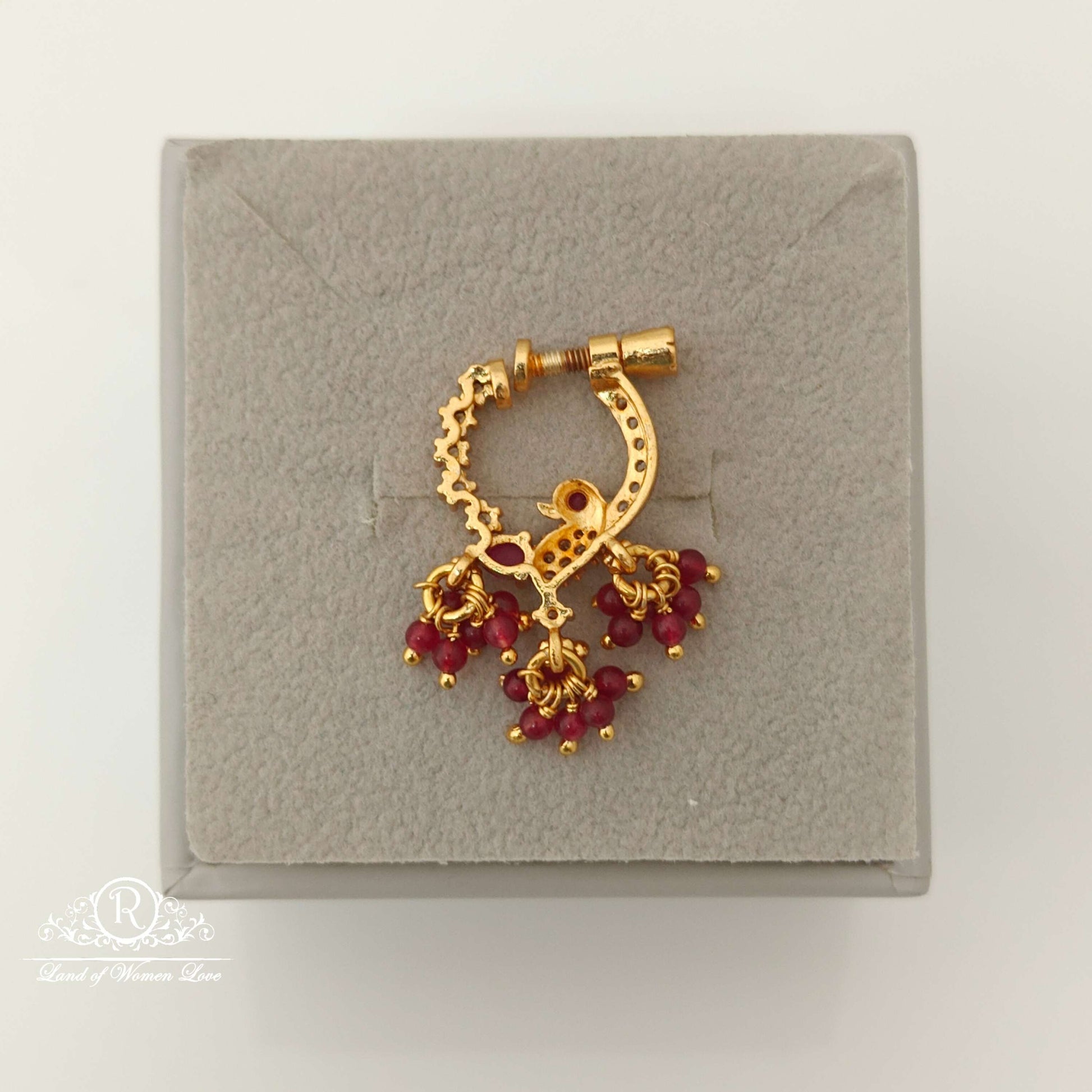 92.5 Silver base gold polish Nose pin peacock Design with white & Kempu stones hanging beads model 1 inches length by ramalacollections