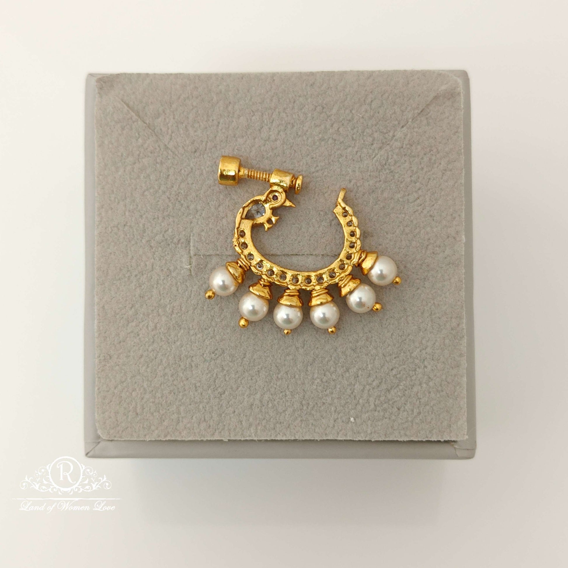 92.5 Silver base gold polish Beautiful Peacock Design Pearls Nose pin with white stones by ramalacollections