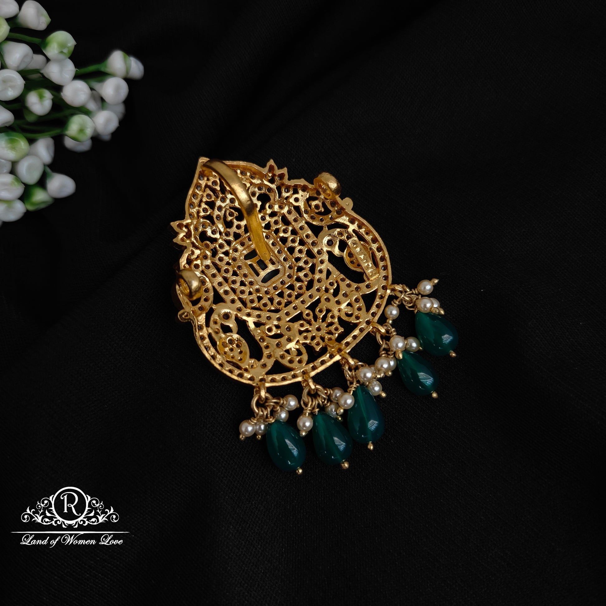 92.5 Silver with gold polish semi precious white stone with green beads hanging openable hook style pendant with 2.3 inches length design by ramalacollections