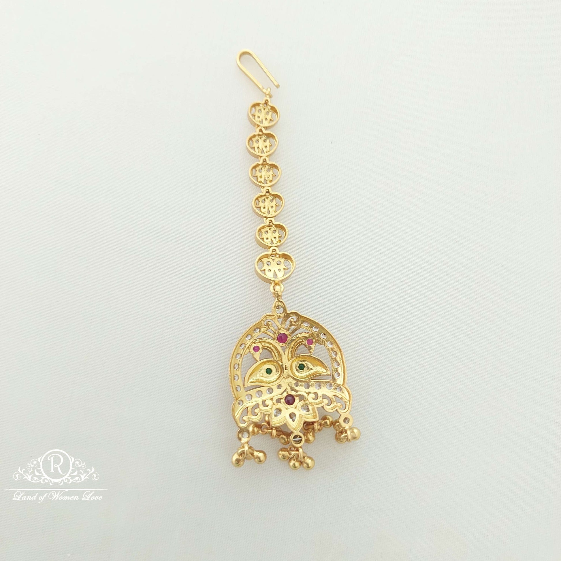 92.5 Silver Jewelry Beautiful Tikkas Peacock Designs With White Stones Middle Kempu & Green Stones With 22k Gold coating With 4.5" Inches Hanging Silver Gold Balls. From Ramalacollections